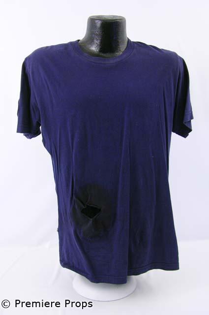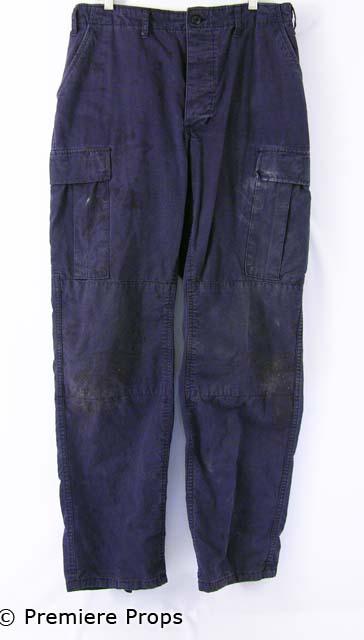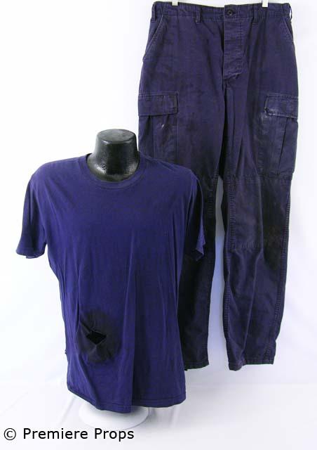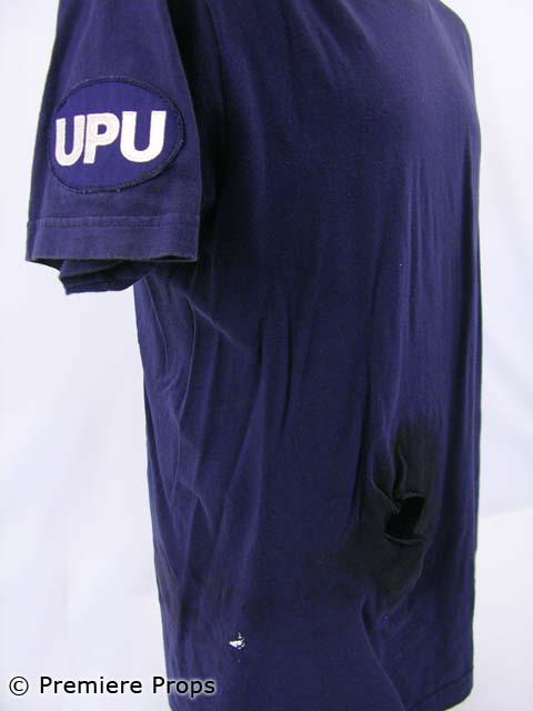 From the imaginative dystopian film, this is Ronald's (Seann William Scott) screen worn costume! It includes a navy-blue "American Apparel" short-sleeve t-shirt with a "UPC" patch on the right sleeve and a bloody gunshot wound on the front (inside tag reads "Ronald" in black marker), and a soiled and bloodstained pair of faded navy "True Spec" cargo pants.