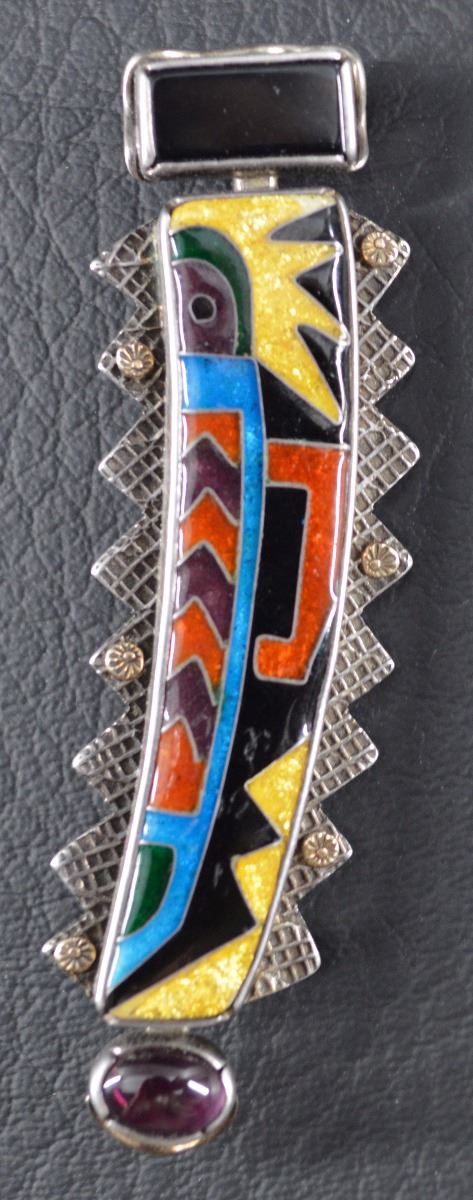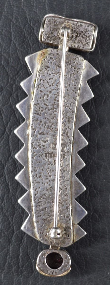 Contemporary. Sterling silver and 14kt gold. Depicting kachina figure with inlaid human figure design. Signed B W. .75" x 2.25". Approximately 19.4 grams.