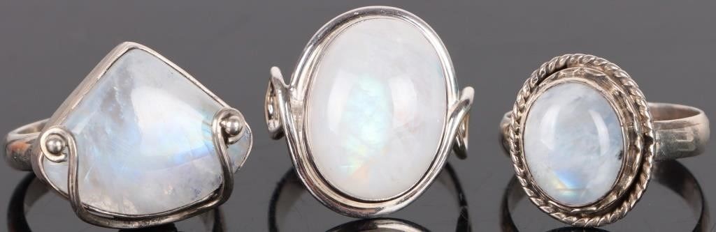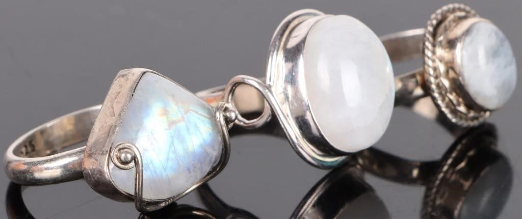 Southwest-style moonstone sterling silver ladies rings. There are 3 rings included in this lot. The triangle shaped ring is a size 7, the small oval is also a size 7 and the larger oval with the loops on the side of the ring is a size 6.