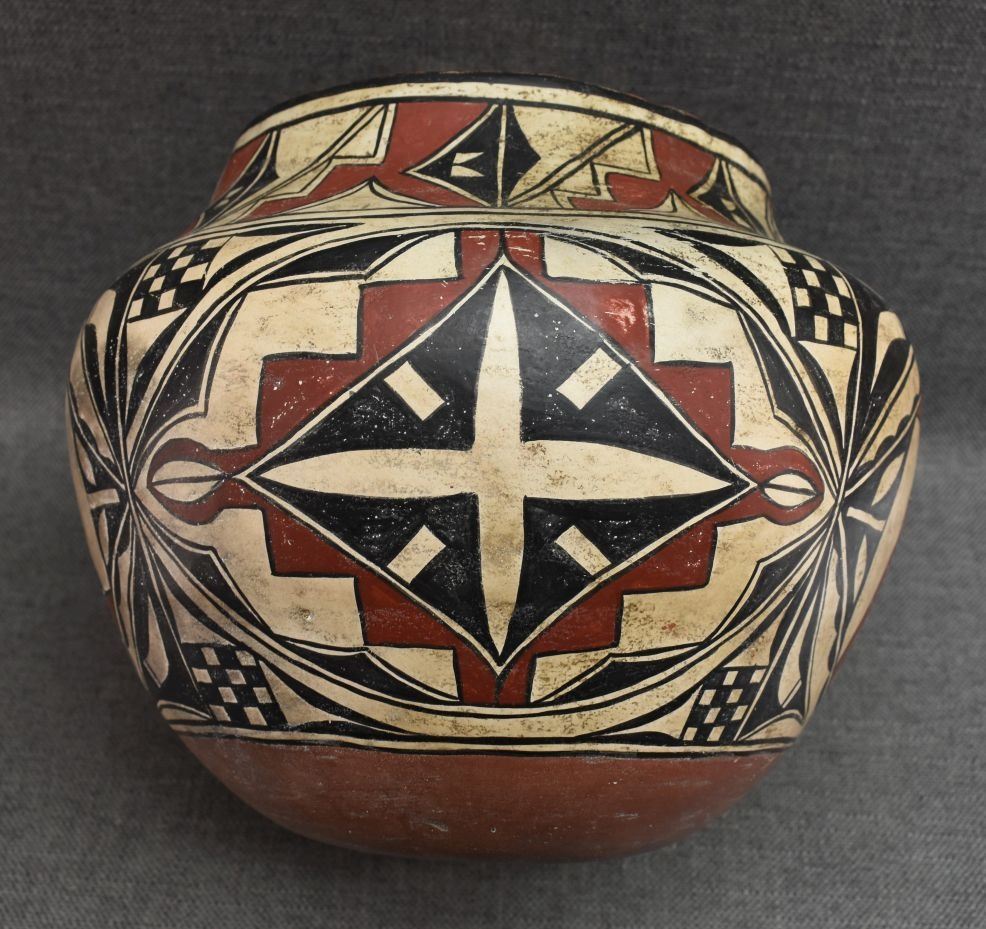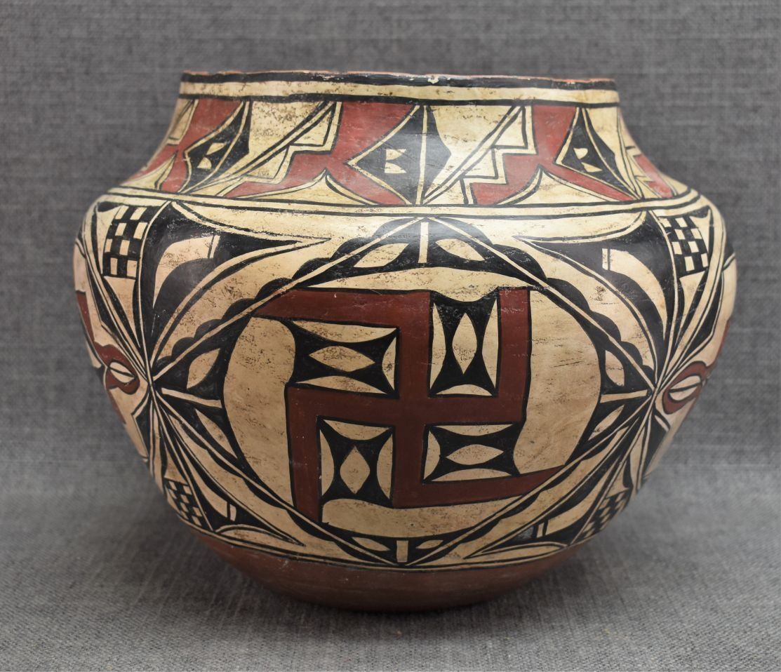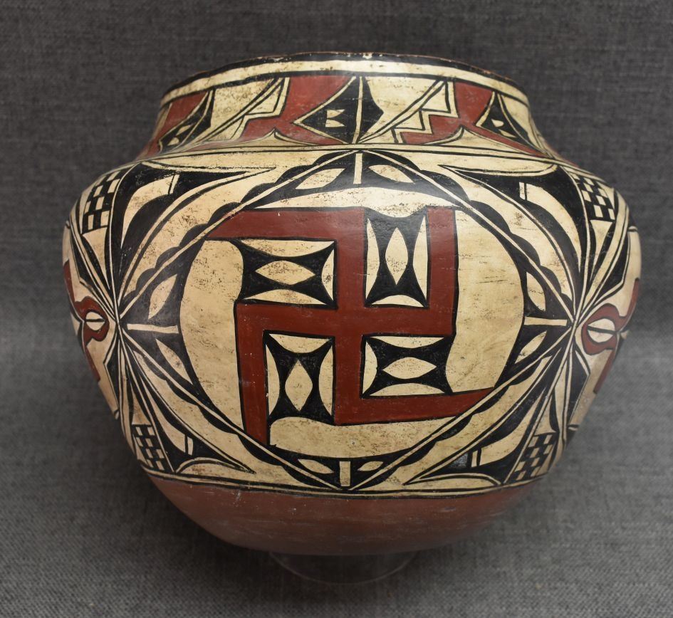 20th century Hand made from commercial clay with polychrome painted geometric and whirling log design 8.75" x 10.5"