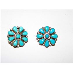 Vintage Old Pawn Native American Zuni Sterling Silver Turquoise Rosette Cluster Clip On Earrings