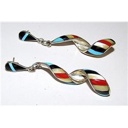 For your consideration is a pair of these fabulous vintage Zuni sterling silver inlay pierced dangle spiral earrings in wonderful vintage condition by