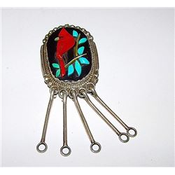 Native American RONNIE CALAVAZA Old Pawn Zuni Sterling Silver Coral Turquoise Cardinal Pin Brooch Pe