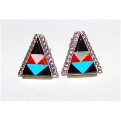 For your consideration is a pair of these fabulous, intricately inlaid, vintage Zuni sterling silver mosaic inlay pierced post earrings in wonderful