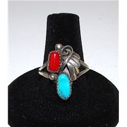 Navajo Old Pawn Native American Sterling Silver Turquoise Coral Ring Size 8.5 Squash Blossom Design
