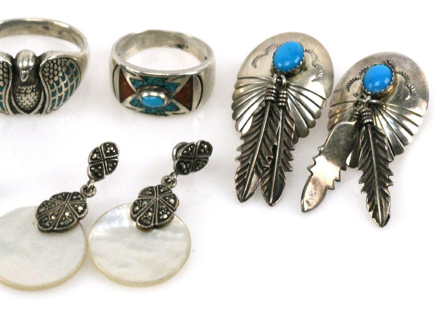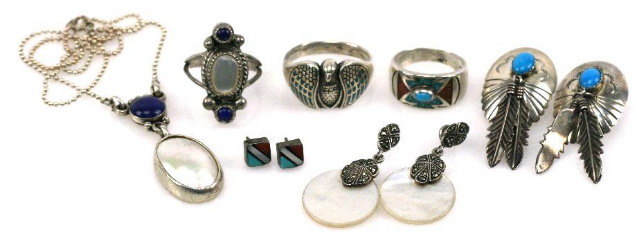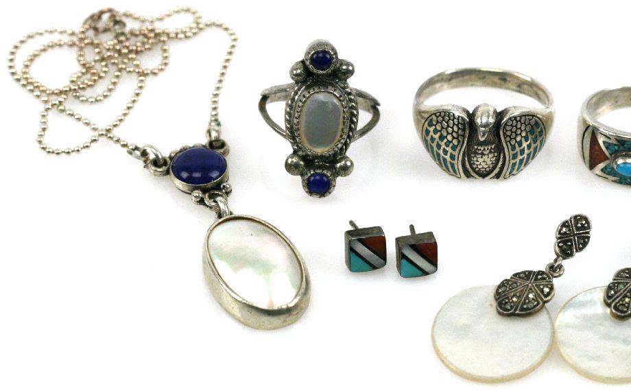 A collection of Mexican and Navajo sterling silver jewelry, including: (3) pairs of earrings, (2) size 9 rings, a size 13 ring, and a 17 inch mother of pearl and lapis necklace. Weight: 1.8 ozt Condition: Very good