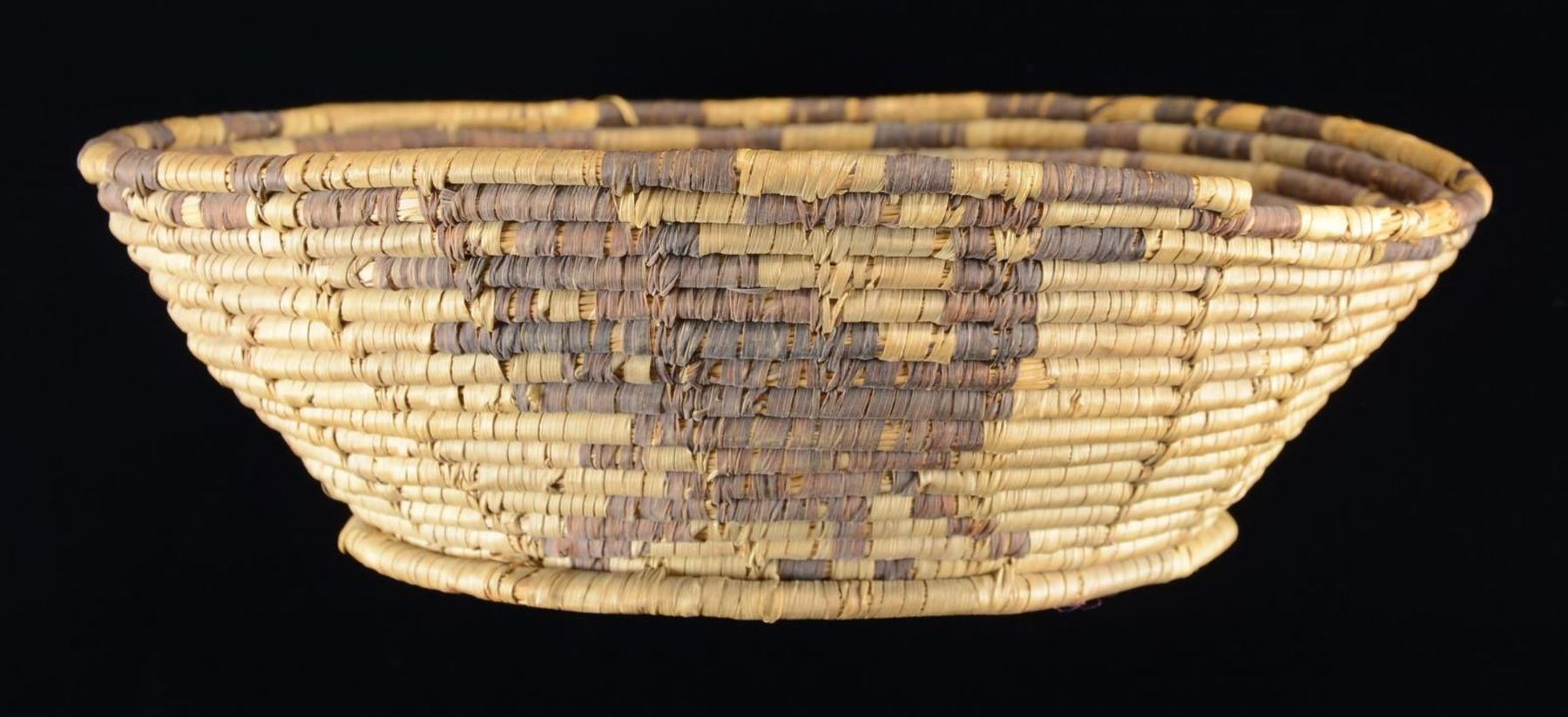 Vintage 10.5" diameter, 3.5" high woven tapering bowl, Navaho in style, design of 3 large, stylized birds on sides. CONDITION: good to very good overall, few loose or missing strands at top edge. PROVENANCE: Martin Lane Historic & Western Americana Lifetime Collection. (02-21629/JS). $400-600.