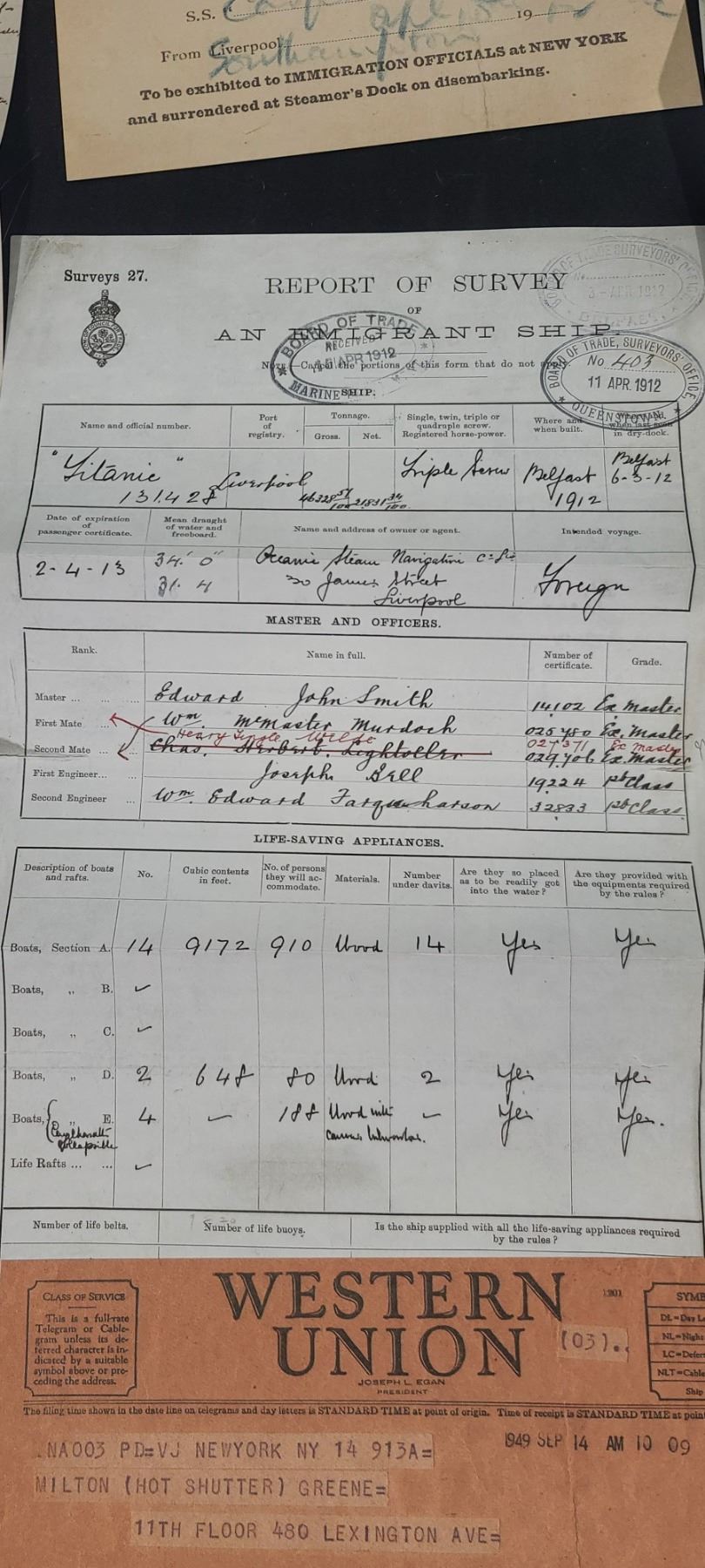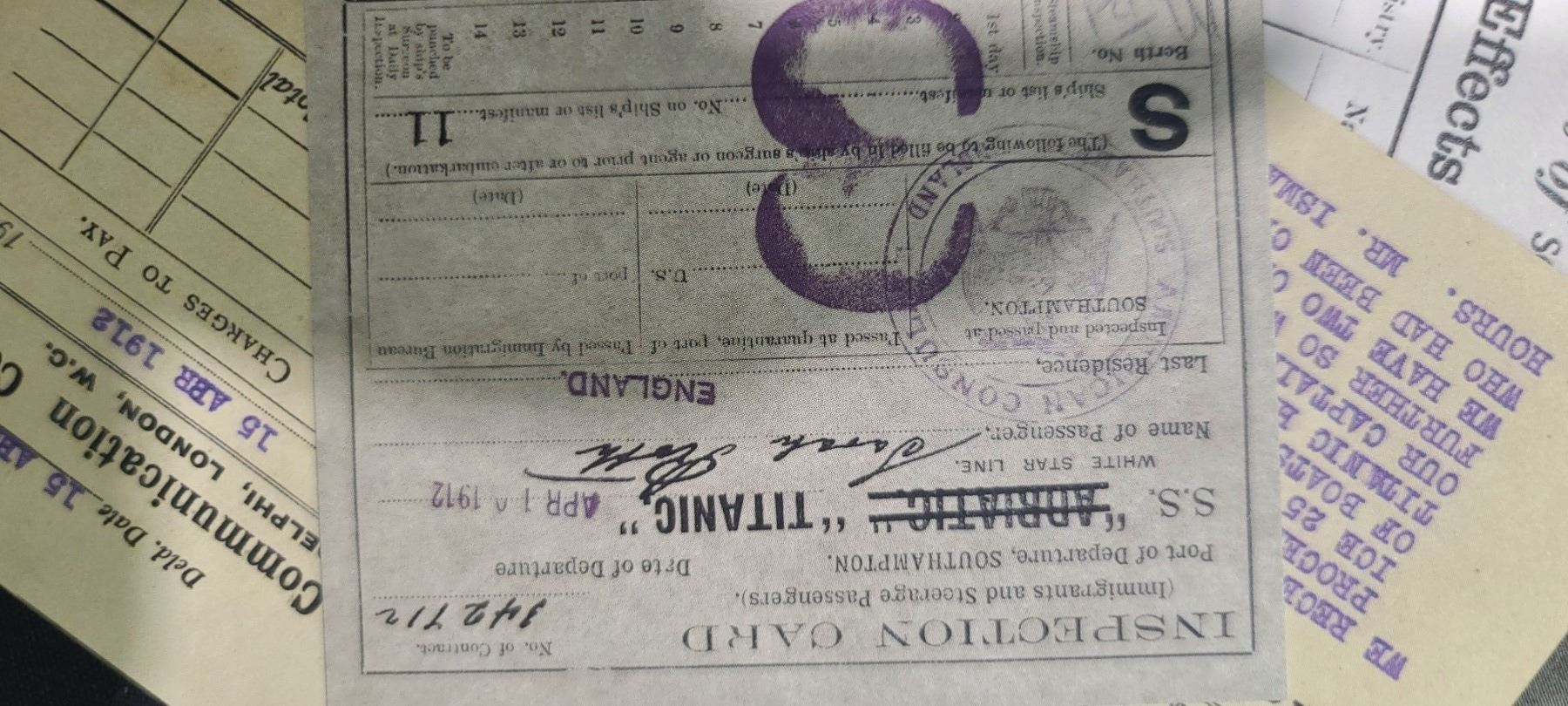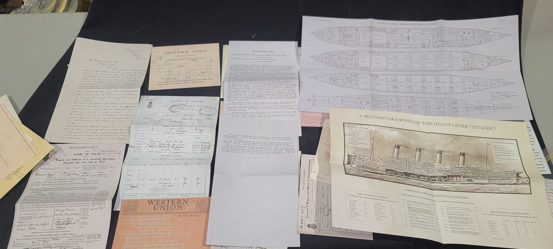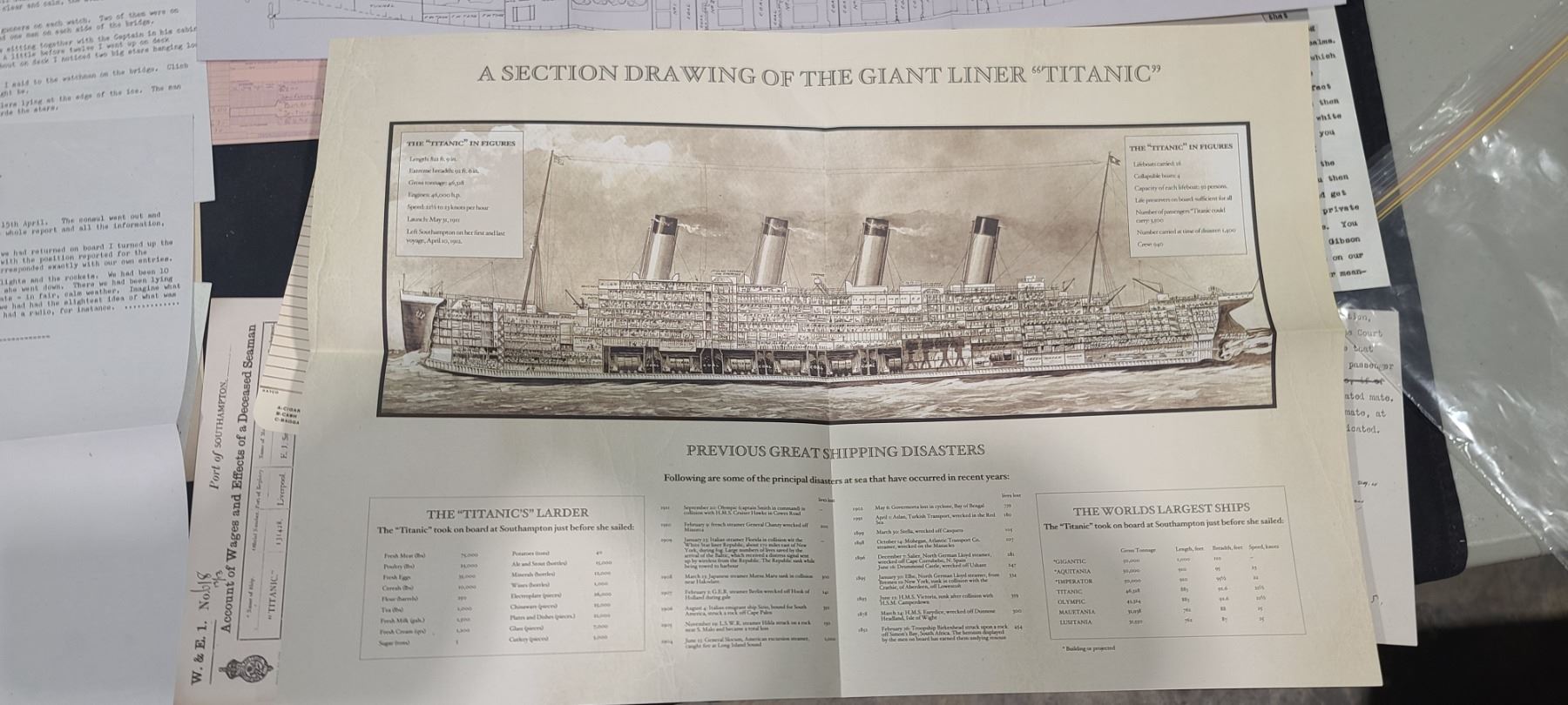 SOUVENIOR/ COPPIES OF OFFICIAL DOCUMENTS RELATING TO THE TITANIC - BOARDING PASSES, INSPECTION CARDS, BLUEPRINTS