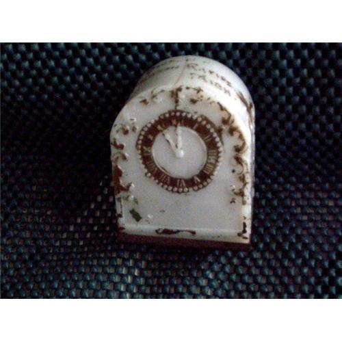 A souvenir of Eaton Rapids, Mich. in the shape of a clock. This is a rare vintage candy container with a tin sliding base. It is made of Milk Glass and is decorated with gold paint. It is also marked on top "Souvenir of Eaton Rapids Mich". The paint is worn in a number of places. There is a minor chip on the base and a hairline crack on one end that is 1" long. The piece has a significant amount filigree on all edges front, side, and back.