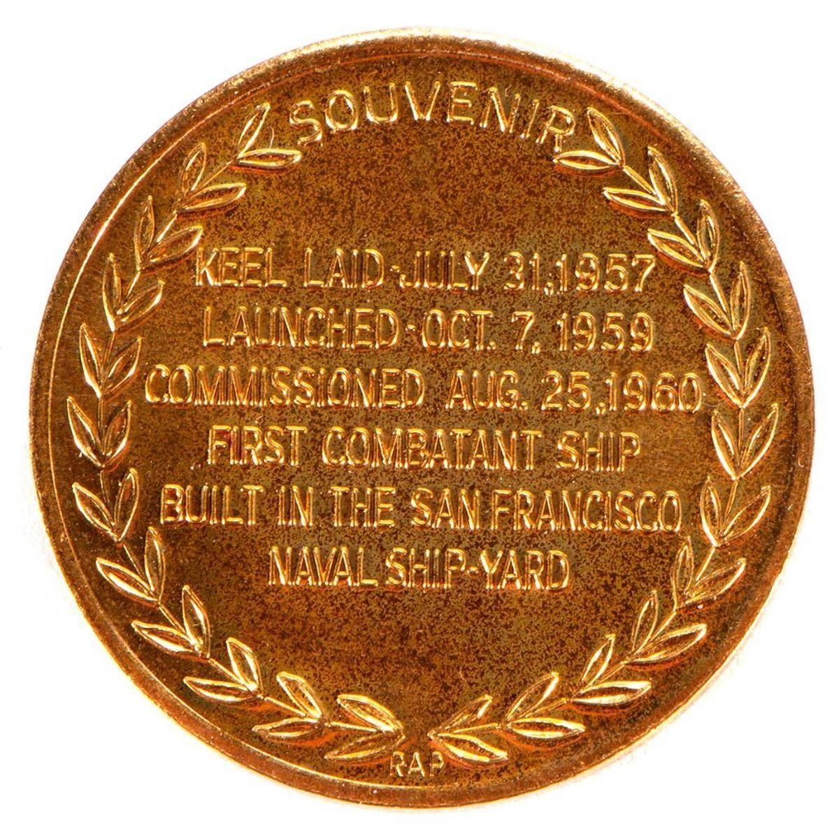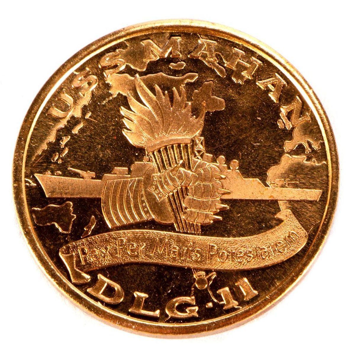 USS Mahan DLG-11 gold-toned Commemorative commissioning souvenir coin: "First Combatant Ship Built in the San Francisco Naval Ship-Yard." 1 1/4in. diam.