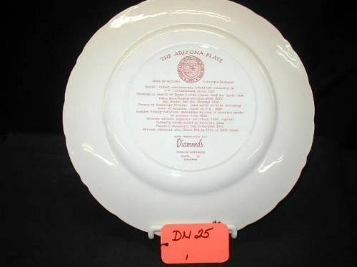 SOUVENIR PLATE, MFG JOHNSON BROTHERS, ENGLAND, 10 5/8in PLATE W/ SCALLOPED EDGE, inTHE ARIZONA PLATEin RED TRANSFER inGREAT SEAL OF THE STATE OF ARIZONA 1912in CENTER FEATURES THE GRAND CANYON BACK HAS DATA OF ARIZONA