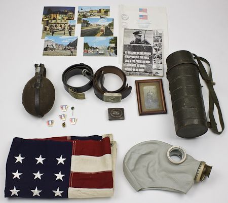 Group of various relics obtained by an American soldier while on duty serving in the American Secor of Berlin in the 1970s. A rather oddball collection includes: German WWII M-31 field canteen, some wear; 48-star American flag, individually sewn stars and stripes; East German gas mask container containing a Russian-made gas mask and canister; Bundeswehr black belt and buckle, size 100; brass Russian Navy belt buckle and black belt; Soviet and DDR lapel pins; WWII Luftwaffe belt buckle (worn), a silverprint photo, about 2 1/2" x 5", showing a German pioneer soldier of World War I full-length and identified, with full pack, the soldier's 1984 pass through the East/West Berlin checkpoints, and other ephemera. A nice selection that should be viewed.