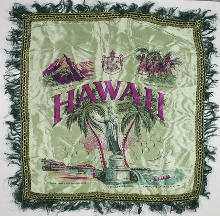 Pair of silk souvenir fringed pillow cases, each 20" x 20", typical touristic items sold to a sailor in Hawaii and Chinatown in San Francisco ca. 1942. The interesting thing about these souvenirs is that they survived one of the worst kamikaze attacks of World War II. The sailor who purchased these items served aboard the USS TERROR, the only minelayer of the fleet built specifically for mine laying during World War II. The vessel served in North Africa, then the South Pacific at Guadalcanal, the Marshall Islands, Iwo Jima and Okinawa. On May 1, 1945 as TERROR lay at anchor, a kamikaze dove toward the ship. Darting through a hole in the smoke screen, the plane crashed into the ship's communication platform and one of its bombs exploded. The other penetrated the main deck before it, too, exploded. The aircraft's engine tore through the ship's bulkheads to land in the wardroom. Fire flared immediately in the superstructure but flooding of the magazines prevented possible explosions. The attack cost 171 casualties: 41 dead, 7 missing, and 123 wounded. These souvenirs, in the path of the destruction, survived untouched. With a letter of provenance from a veteran, the son of the sailor who purchased these relics and was aboard at the time of the attack.