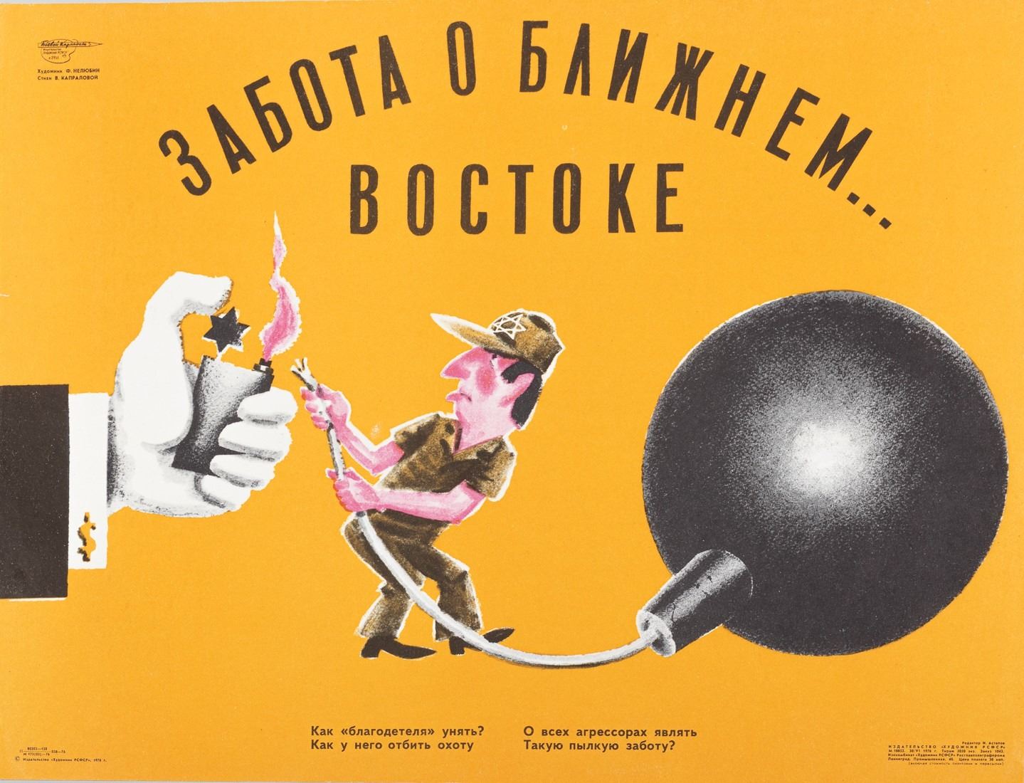 Soviet anti-Zionist propaganda poster, 'Concern for the Near East - How to appease the 'benefactor'? - How to discourage him - About all the aggressors - Such fervent concern'. Artwork by Fedor Nelyubin (b. 1931). 1976. 17 x 22 inches. Poster has minor tear on left edge.