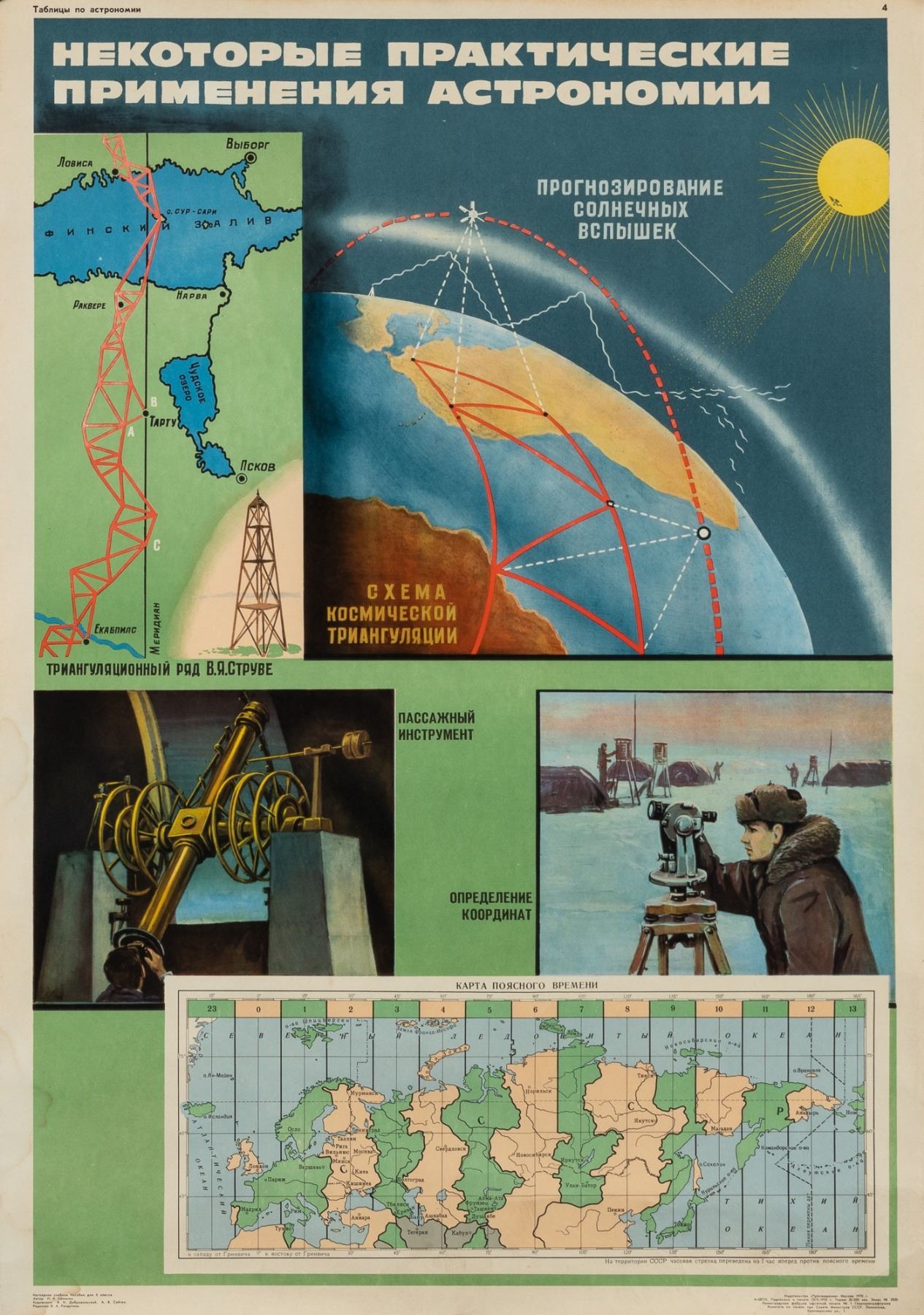 A Soviet teaching aid poster displaying the projected uses of astronomy in everyday life including forecasting solar flashes, triangulation, and defining coordinates. Artwork by V.N. Dobrovolsky and A.V. Salchuk, Enlightenment Publishing House, Leningrad Off-Set Printing Factory, Press Committee under the Council of Ministers of the USSR, 1970, 33.5 x 23 inches. Minor creases and tears on margins, minor loss on left edge, two 1-inch tears at bottom edge, and dampness stains.