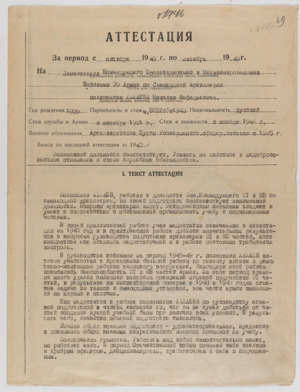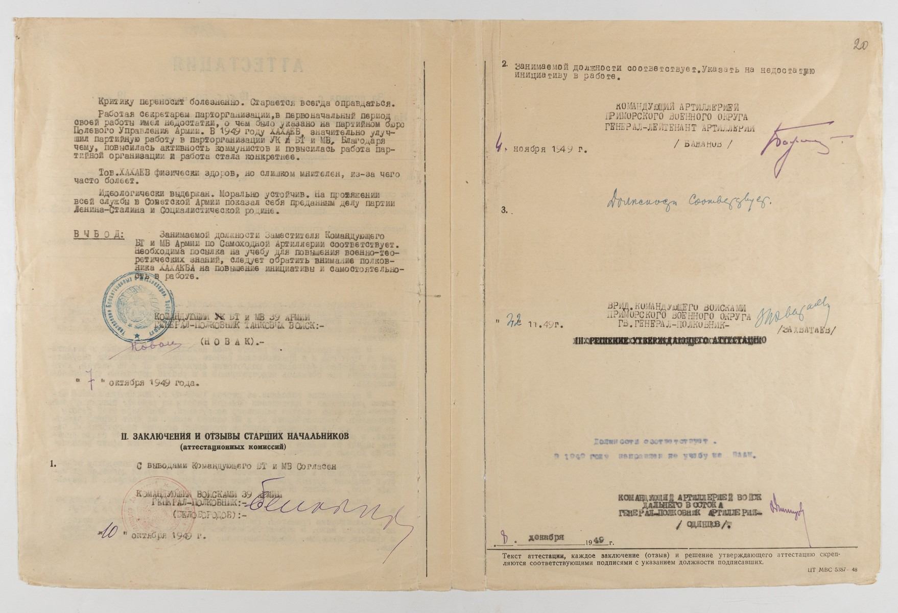 Soviet attestation, three pages, of Deputy Commander of Armored and Mechanical Troops of the 39th Army Colonel Nikoli Kkhakhaev. Document signed on second and third pages. Document dated October-November 1949. 12 x 9 inches. Signed by five generals. 1. Afanasy Beloborodov (1903-1990), general in the Red Army during the Second World War who was twice awarded the title Hero of the Soviet Union, fought in WWII, last signature on the second page. 2. Anatoli Novak (1909-1969), General-Colonel of Tank Troops, first signature on the second page. 3. Jurri Bazhanov (1905-1975), General-Lieutenant of Artillery, first signature on the third page. 4. Nikanor Zakhvatayev (1898-1963), General-Colonel, second signature on the third page. 5. Georgy Odintsov (1900-1972), Colonel-General of the Artillery, third signature on the third page.