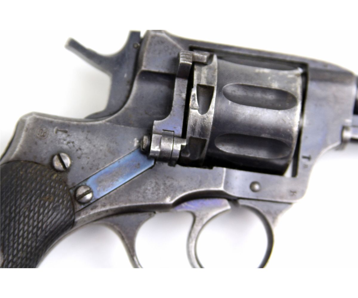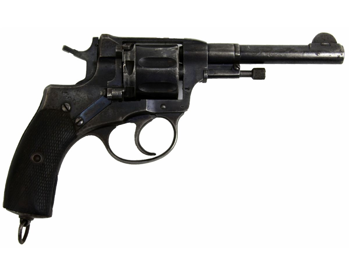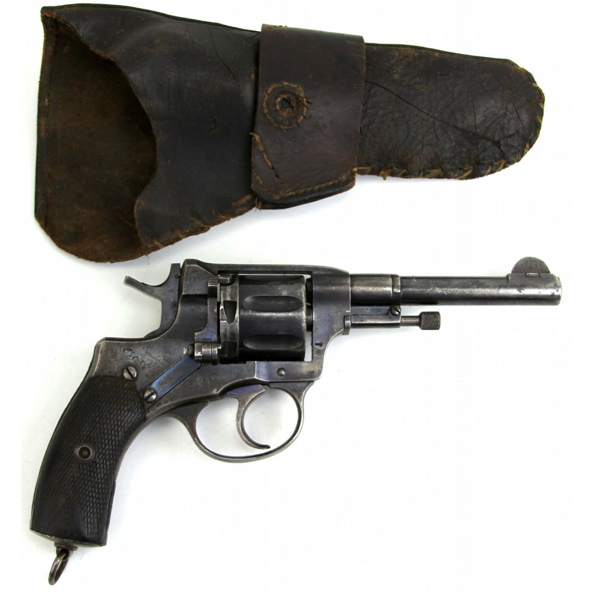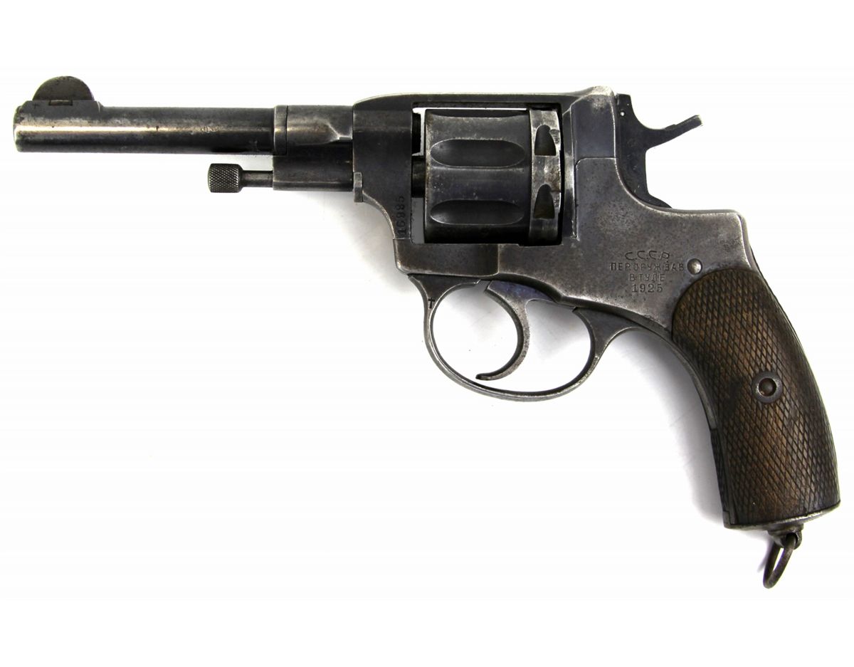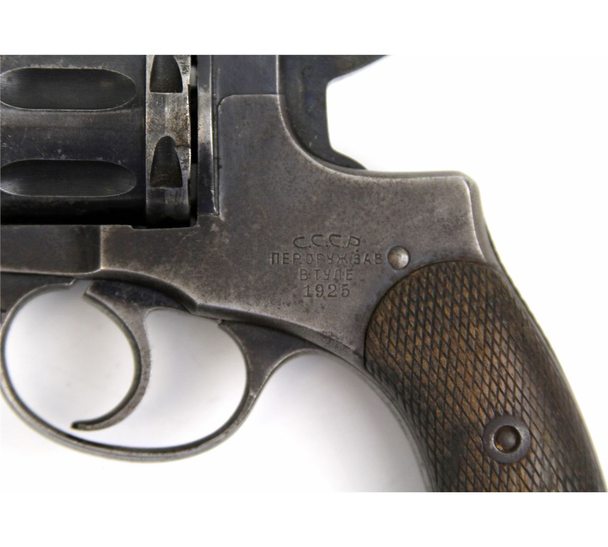 SOVIET NAGANT MODEL 1895 REVOLVER NO IMPORT MARKS Russian Mosin Nagant Model 1895 revolver, dated 1925. Cyrillic print stamped over date on left side of frame. Also marked with various faded inspection marks. No import marks present. Original checkered wood grips. Type: REVOLVER Manufacturer: NAGANT Model: 1895 Caliber / Gauge: .38 Serial Number: 16985 Condition: Bore is very good, original finish about 60%. Some smoothing to checkered grips, but no cracks. Strong action.