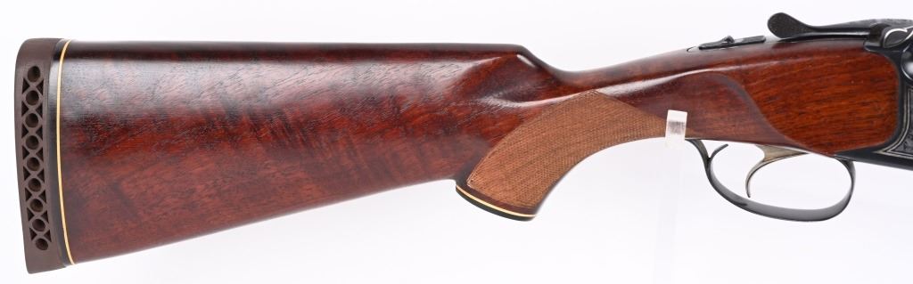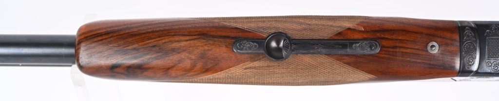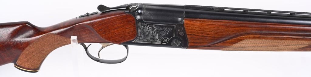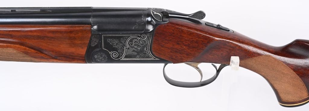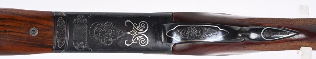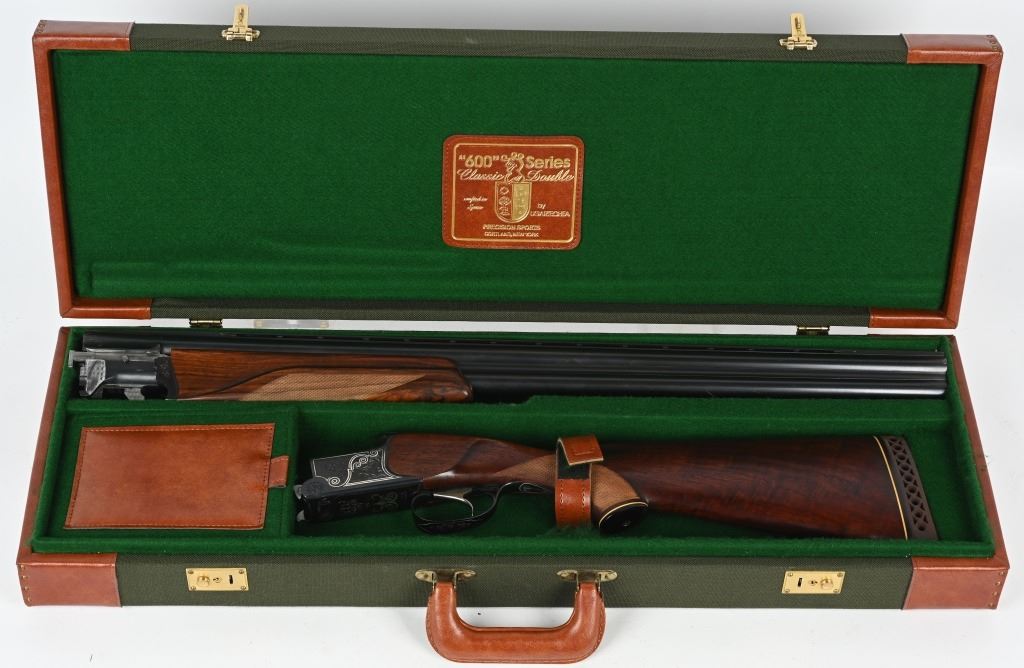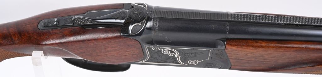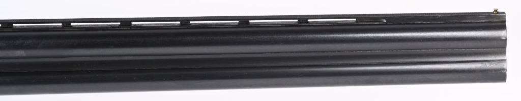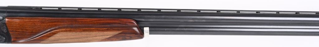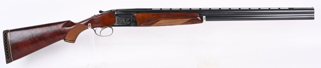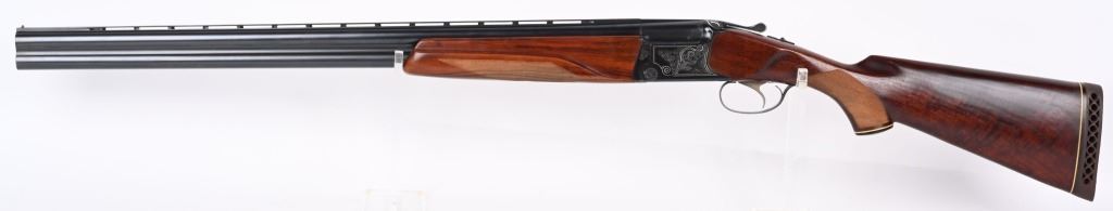 SERIAL NUMBER T-00921 BARREL 28 1/2" CALIBER / GUAGE 12 MANUFACTURED CIRCA 1970'S. Produced in Soviet Russia commercially with over under box lock action, single non-selective trigger. Chambered 12 Ga, 2-3/4" chamber with ejectors. Vent rib barrel choke Full & Modified with brass bead front sight. Balance point marked IJ-27-E1C USSR. Oil finished checkered Pistol grips stock with plastic grips cap. 14-1/2" LOP. Receiver has a relief engraved waterfowl scene on left side with a silver inlaid border. Right side has a flushing grouse scene with same silver border. Rubber recoil pad marked "BAIKAL" barrels are Tula arsenal proofed. Shotgun is housed in a Canvas padded travel luggage case marked Ugartachia inside with a pair of nickel snap caps. CONDITION. Very fine with over 98% blue finish remaining. Breech faces show slight use. Action operates properly and ejectors are in time. Stocks are very good with a few very minor impressions. MODERN