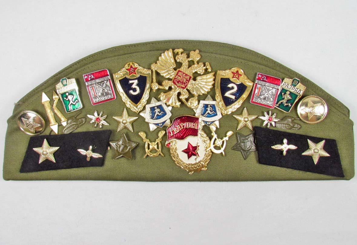 SOVIET SIDE HAT W/ PINS AND PATCHES