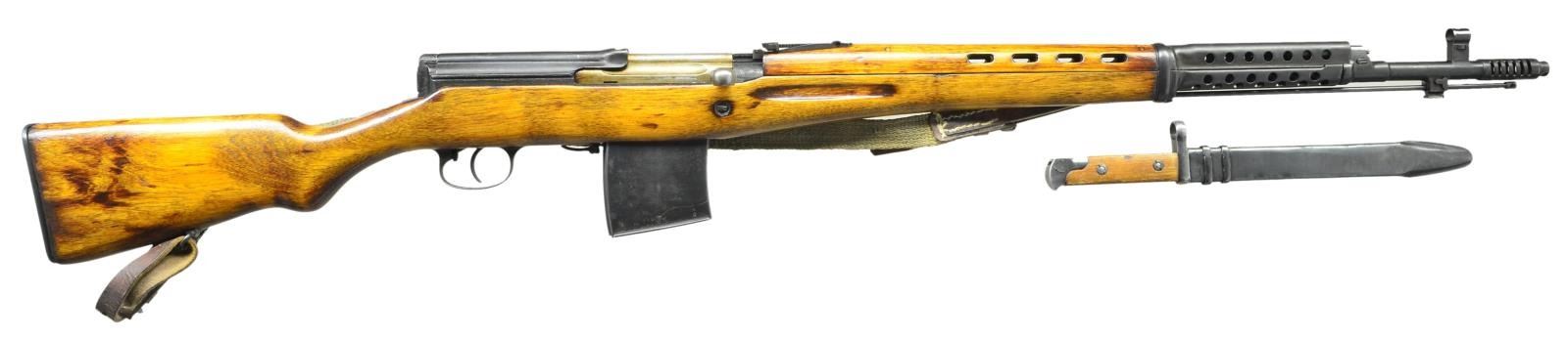 Cal. 7.62x54R. S# HA1398. Bbl. 26 1/2" w/ muzzle brake. Serial numbers mismatched throughout. Top of receiver has Tula star w/ 1941 date. This rifle does not appear to be a traditional Soviet refurbish & may be a Finn issued example but there are no visible "SA" markings. Tangent rear sight graduated to 1500m. Hooded post front sight. Cleaning rod is present. Hardwood stock set. Left side sling provision w/ canvas SVT-40 sling. MAGS: 1-10 rd. detachable. UNATTACHED ACCESSORIES: SVT-40 bayonet w/ scabbard. Bayonet is in good condition w/ silvering wear & worn handles. CONDITION: refinished stock w/ added varnish, a few repaired cracks, dings, dents & handling marks. Metal retains 90% arsenal rework type blue w/ scattered fading. Fair bore w/ scattered frosting & light pitting. (22-2547/MJC). CURIO. $700-1100.