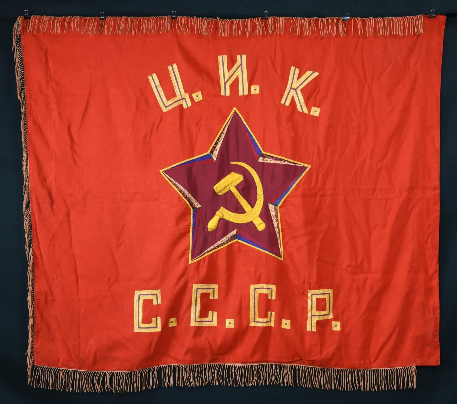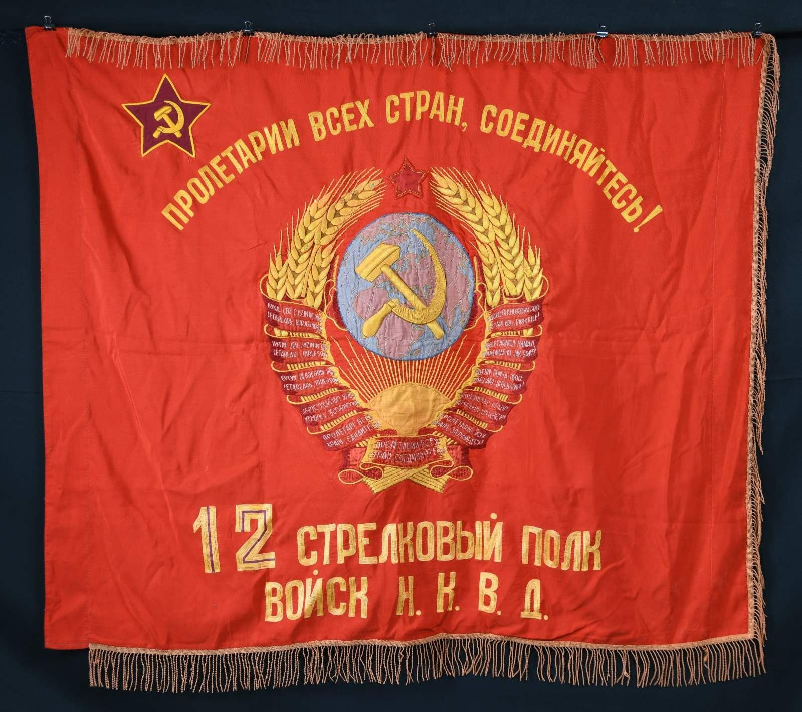 42" x 48" double sided direct embroidered red velvet with silk embroidery, one side with unit designation and other with typical propaganda slogan: "Proletarians of the World Unite", sleeve hoist. CONDITION: good overall, double panels sewn together, fringe, staining & soiling, good colors. (02-19473-69/JS). $200-400.