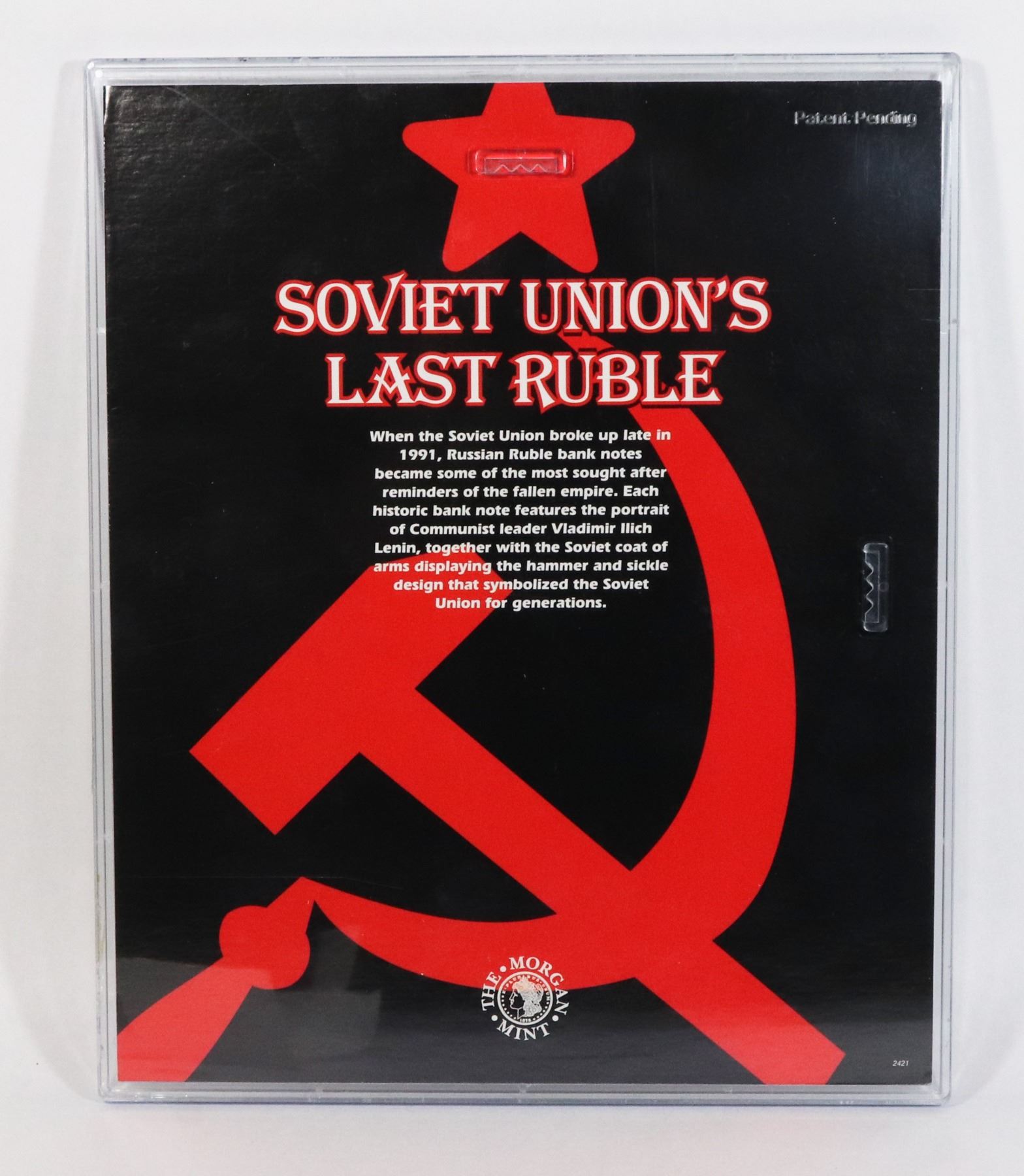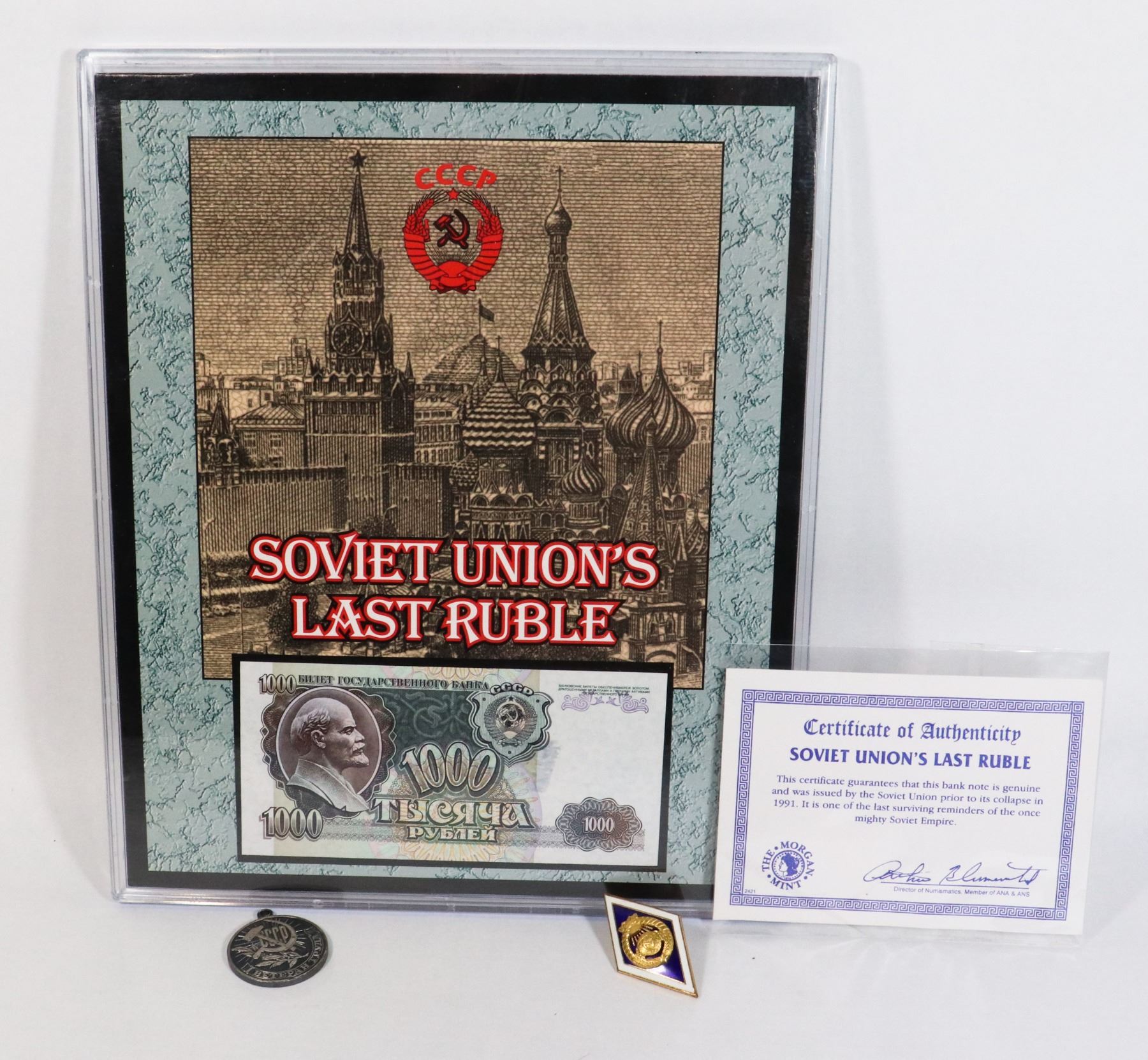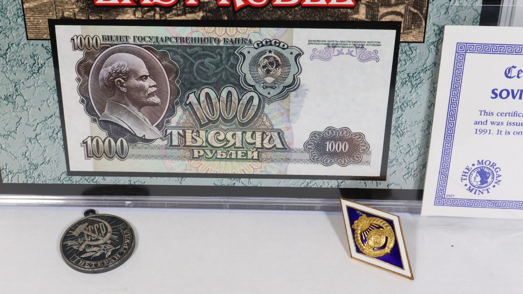 WITH COA. BILL LOOKS TO BE BU. READ ABOUT THIS BILL ON THE BACK OF DISPLAY. DISPLAYS FRONT IS QUITE BEAUTIFUL, THE BACK IS QUITE OMINOUS. TWO BONUS VINTAGE CCCP USSR BADGES