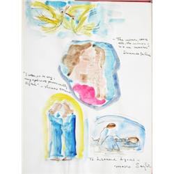 <b>1261. MOSES SOYER </b>(1899 - 1974) Russian-American social-realist artist. Superb set of four original pencil and watercolor drawings executed on the 11" x 14" front flyleaf of the retrospective <i>Moses Soyer</i>, World Publishing Co., New York, first edition. The sketches depict birds in flight, two ladies in profile, two figures embracing each other and a figure seated before a reclining figure, all executed in pencil and watercolor shades of yellow, blue, brown and red. Soyer adds two quotes: "<i>The mirror, above all, the mirror - is our teacher Leonardo Da Vinci</i>" and "<i>I wear, so to say, my eyebrows permanently lifted. Thomas Mann</i>". Finally, Soyer inscribes the book to critic Leonard Lyons and signs in full at bottom. Fine condition, a beautiful piece for display.<b>$300-500</b>