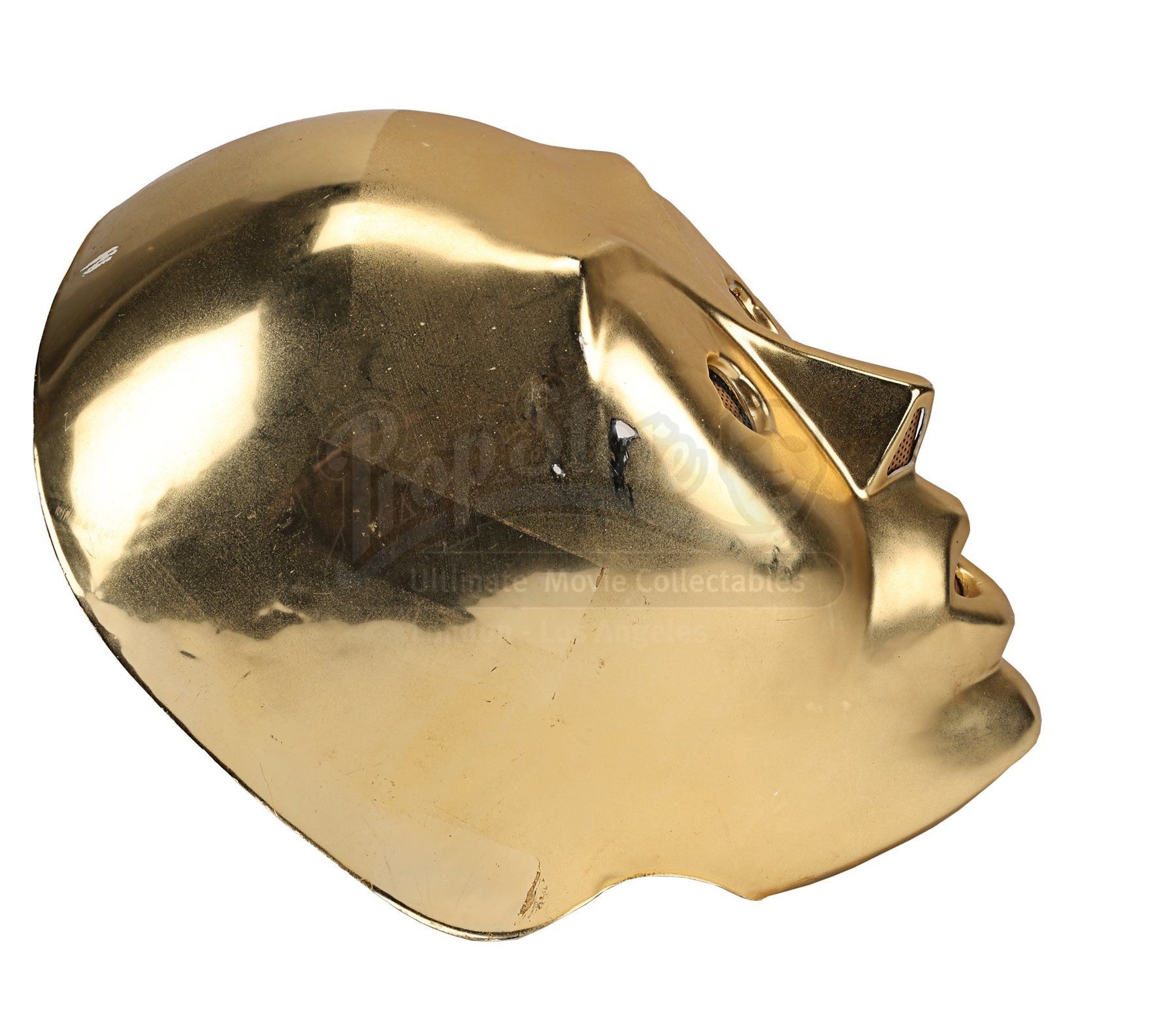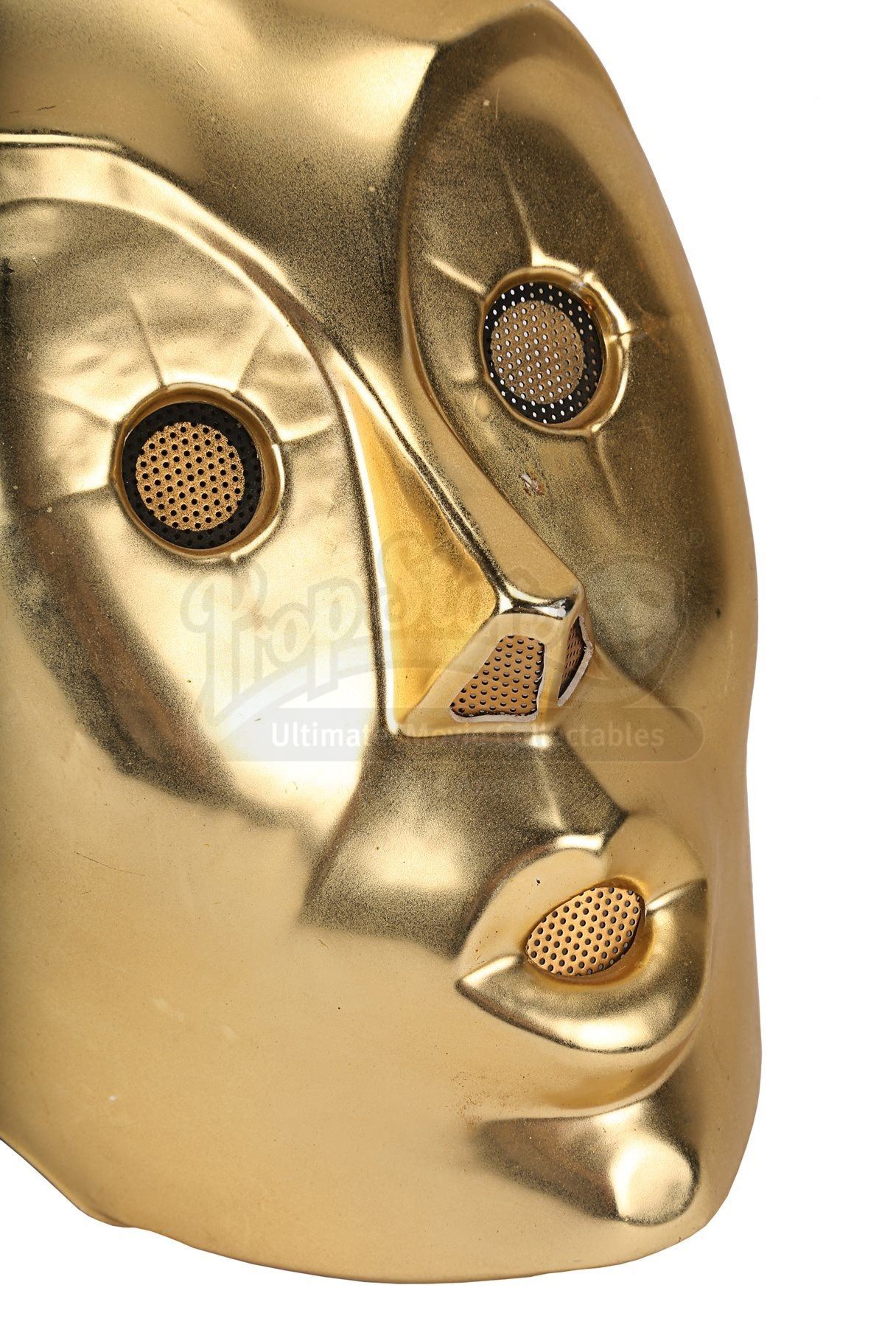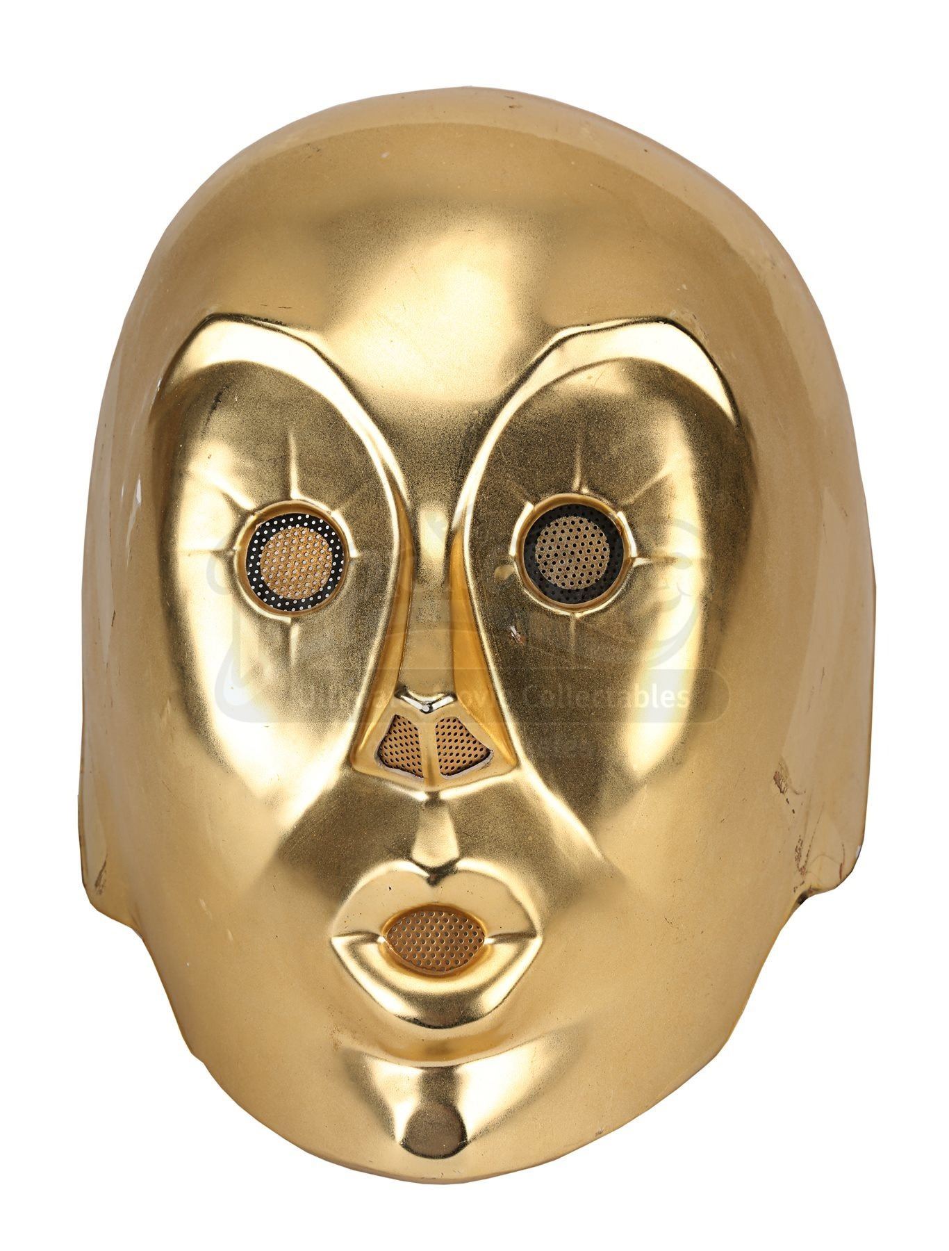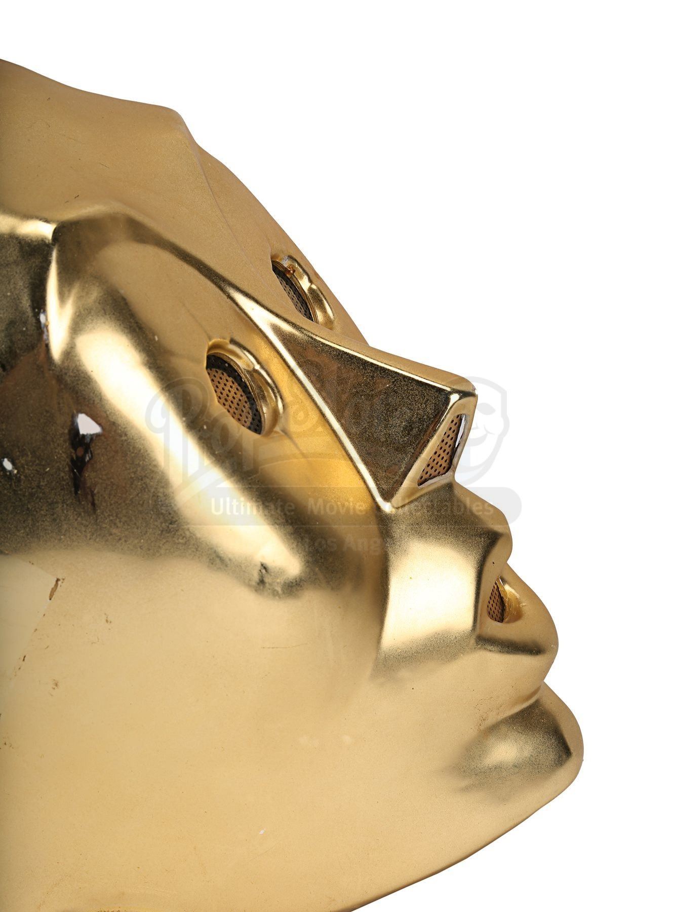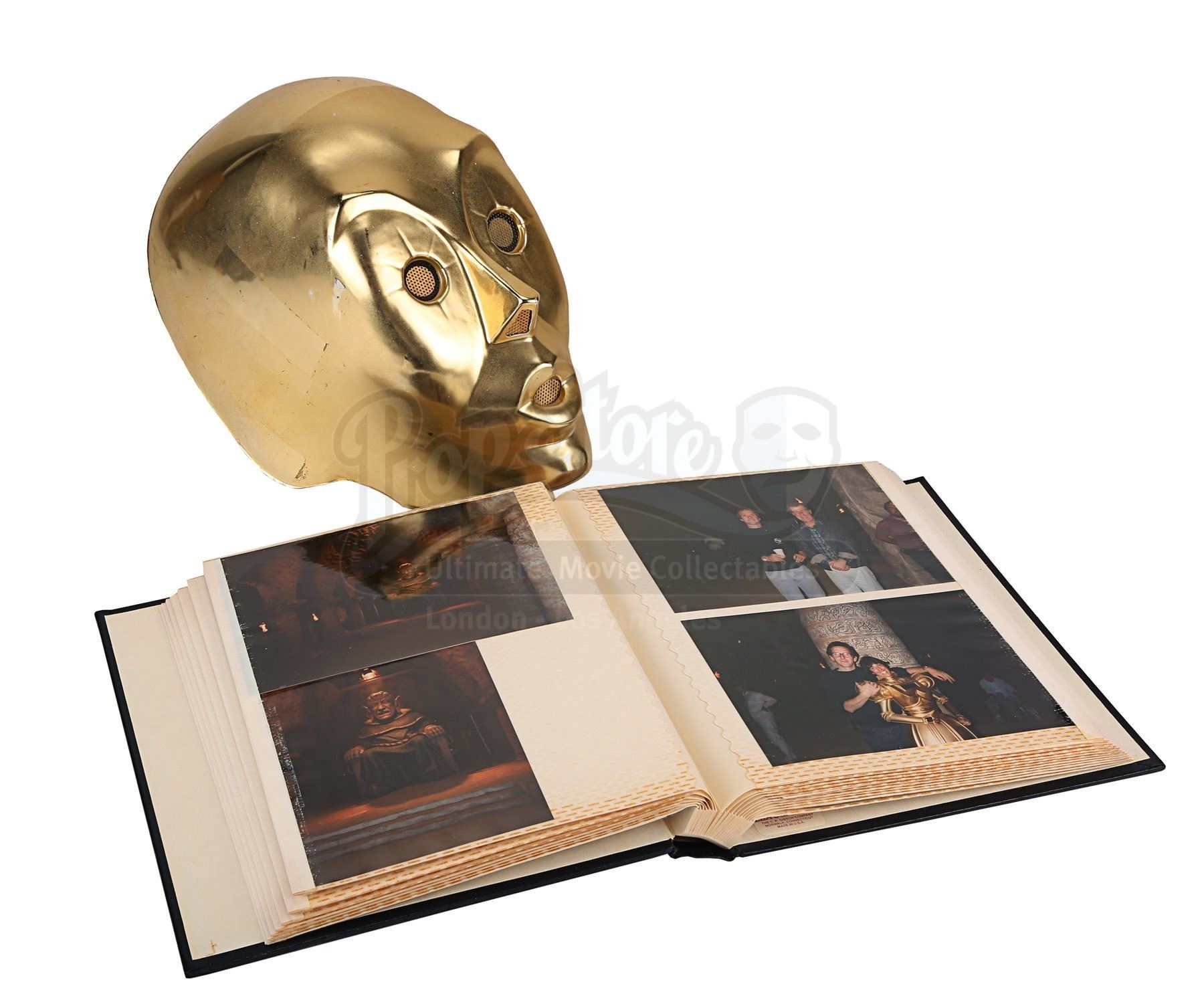 The mask is made of vacuum-formed plastic and is detailed with geometric lines for the cheeks and the nose. Finished in faux gold, the interior of the mask features several pieces of metal mesh adhered to the openings for the eyes, nose and mouth. The photo album is bound in blue leather with printed faux-gold patterns on the front cover and spine, and contains 65 colour photos and three Polaroid images showing various cast members on the set.