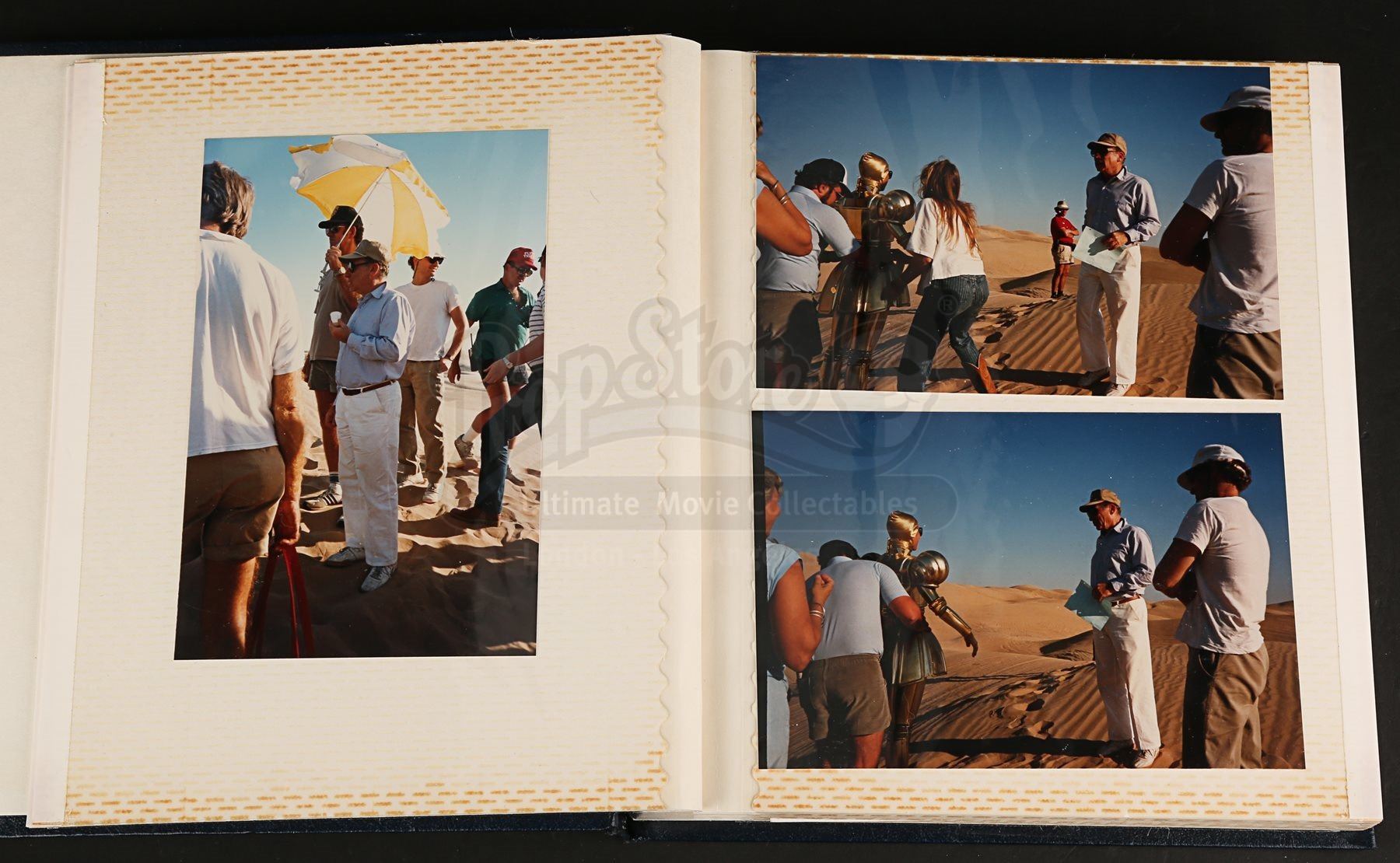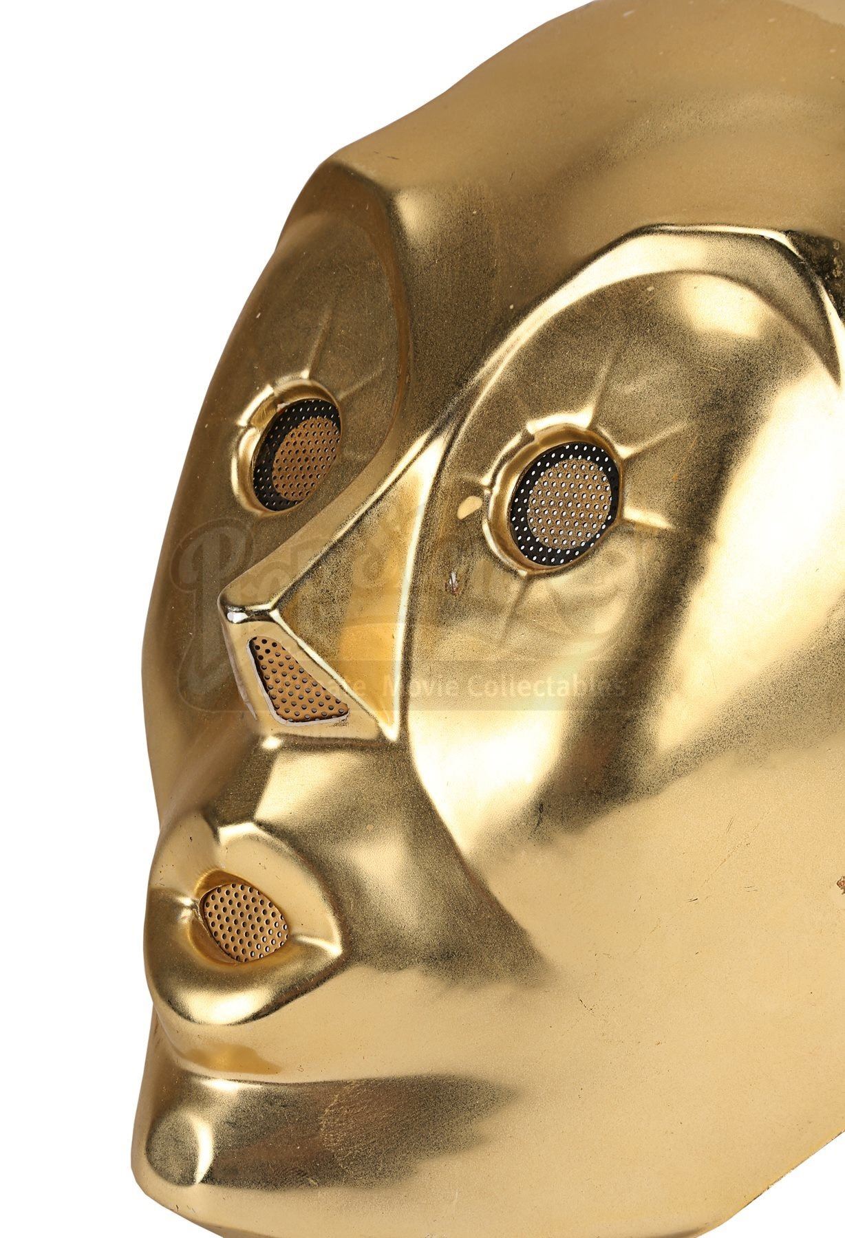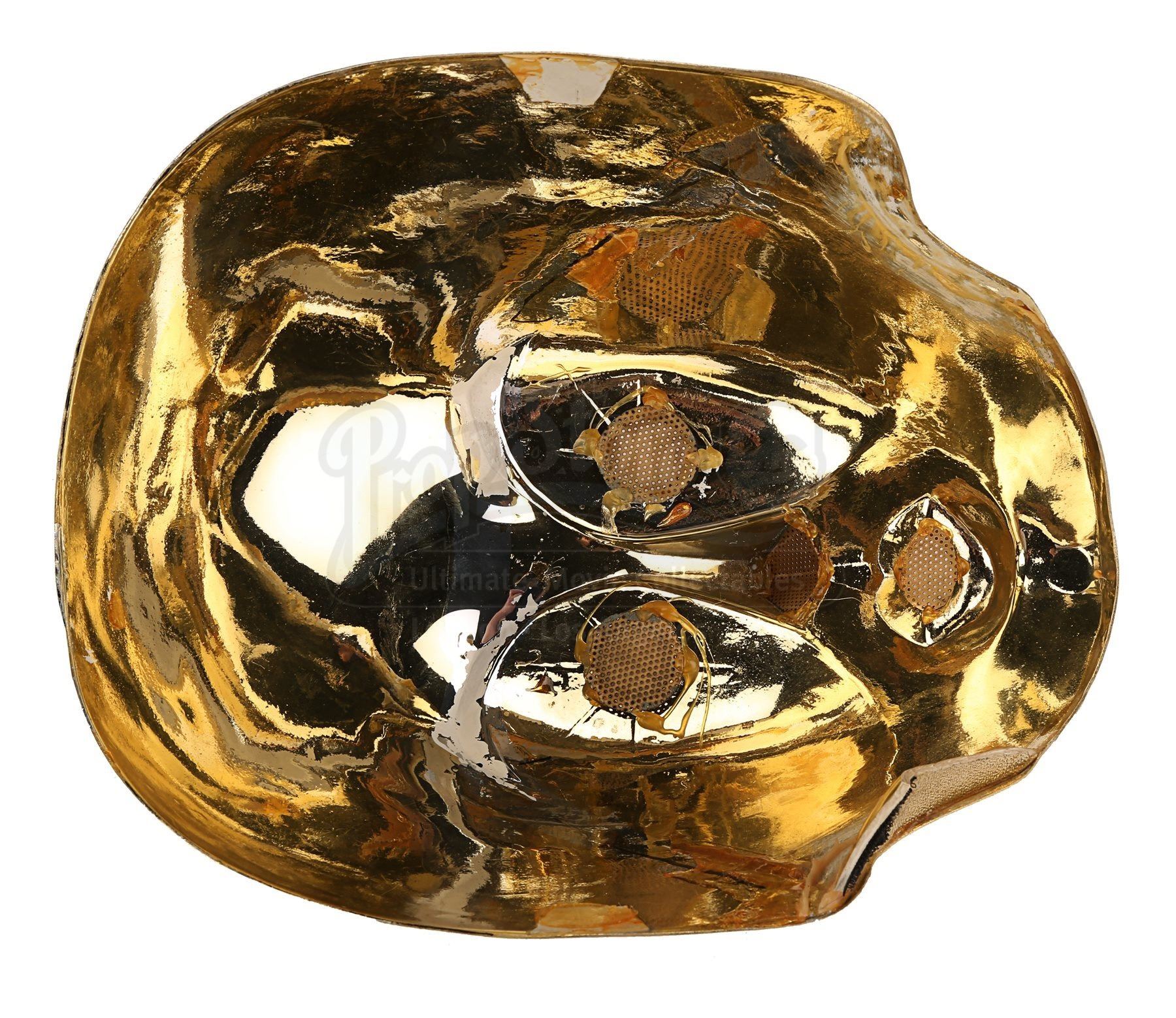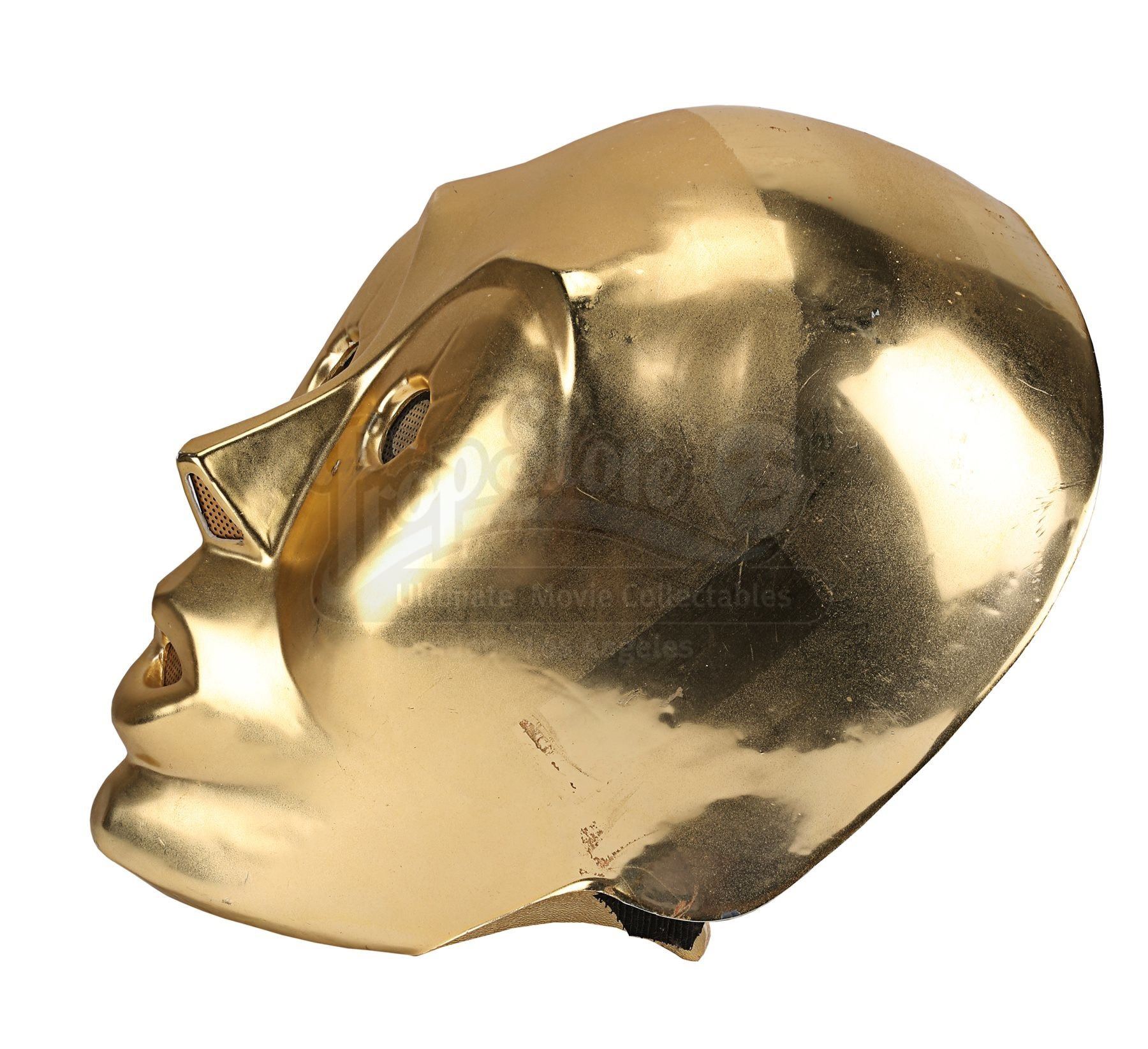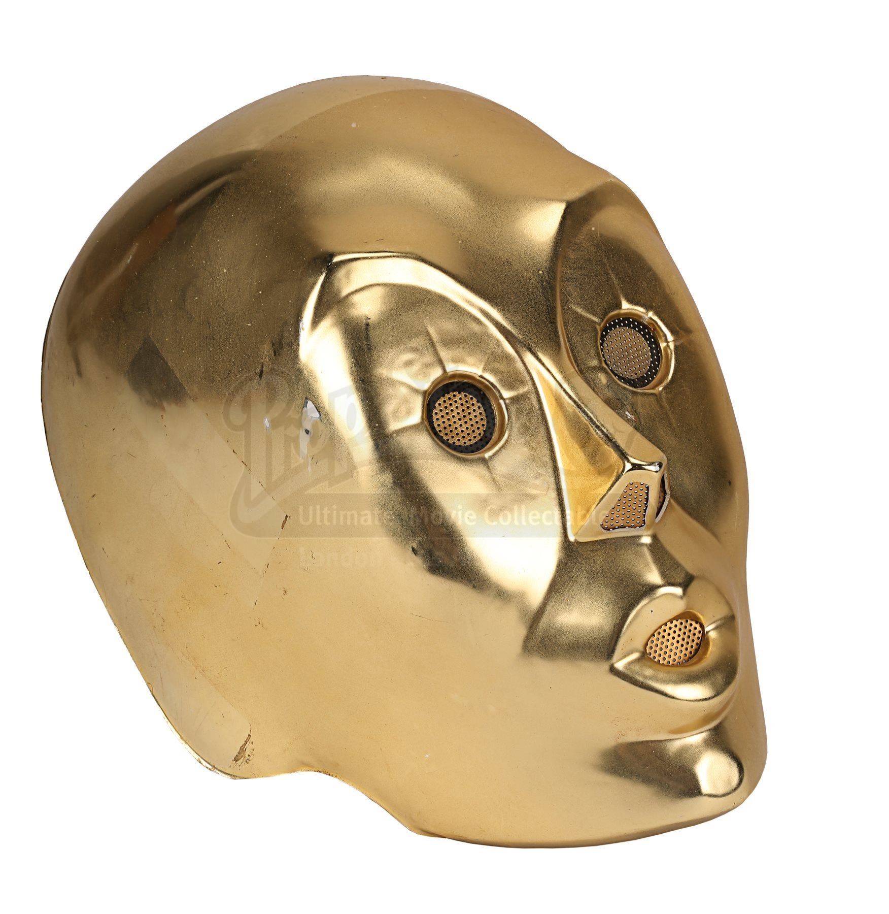The mask is made of vacuum-formed plastic and is detailed with geometric lines for the cheeks and the nose. Finished in faux gold, the interior of the mask features several pieces of metal mesh adhered to the openings for the eyes, nose and mouth. The photo album is bound in blue leather with printed faux-gold patterns on the front cover and spine, and contains 65 colour photos and three Polaroid images showing various cast members on the set.