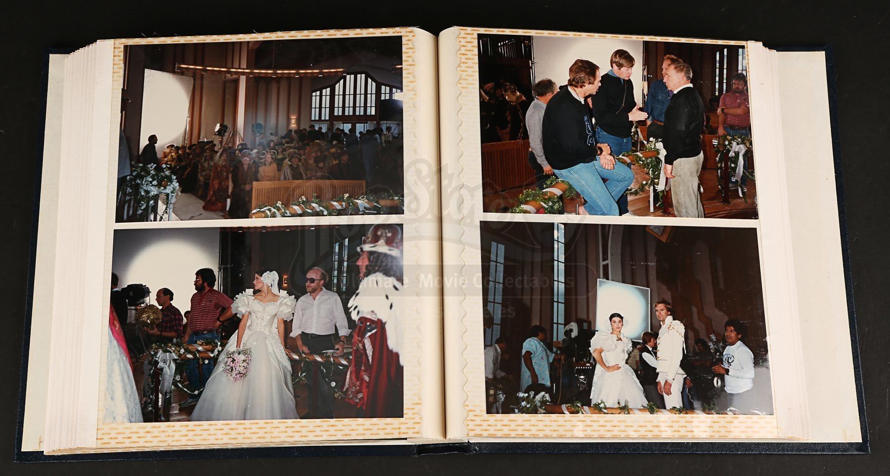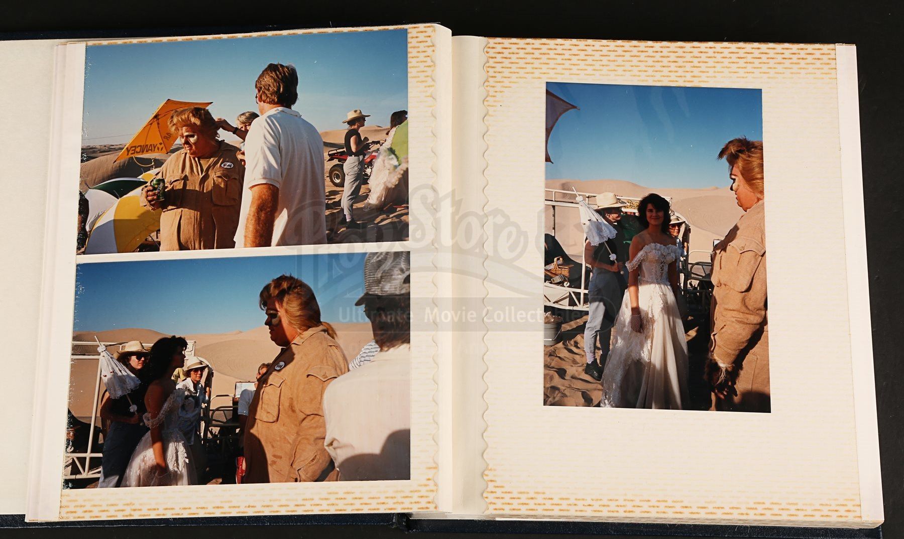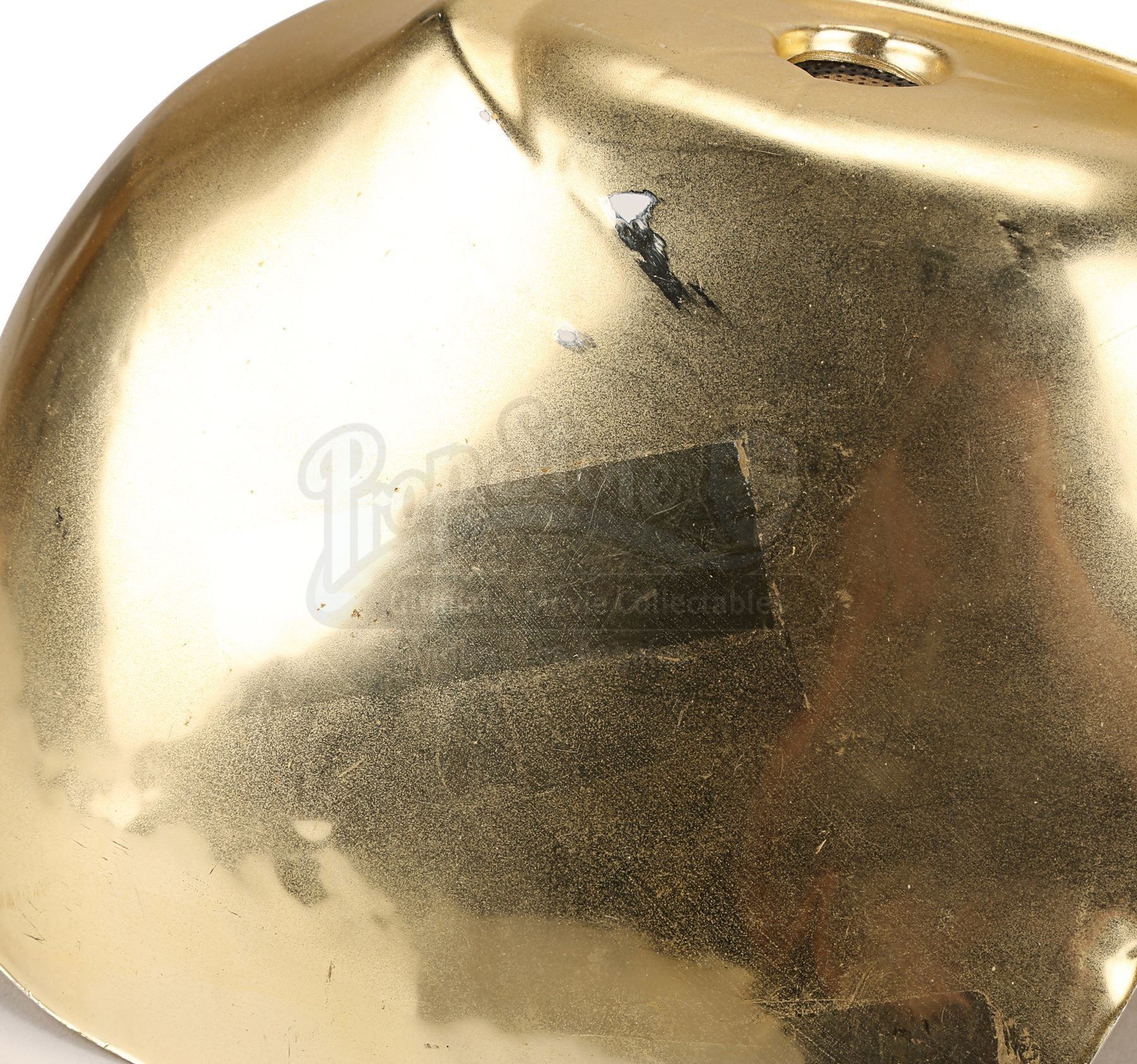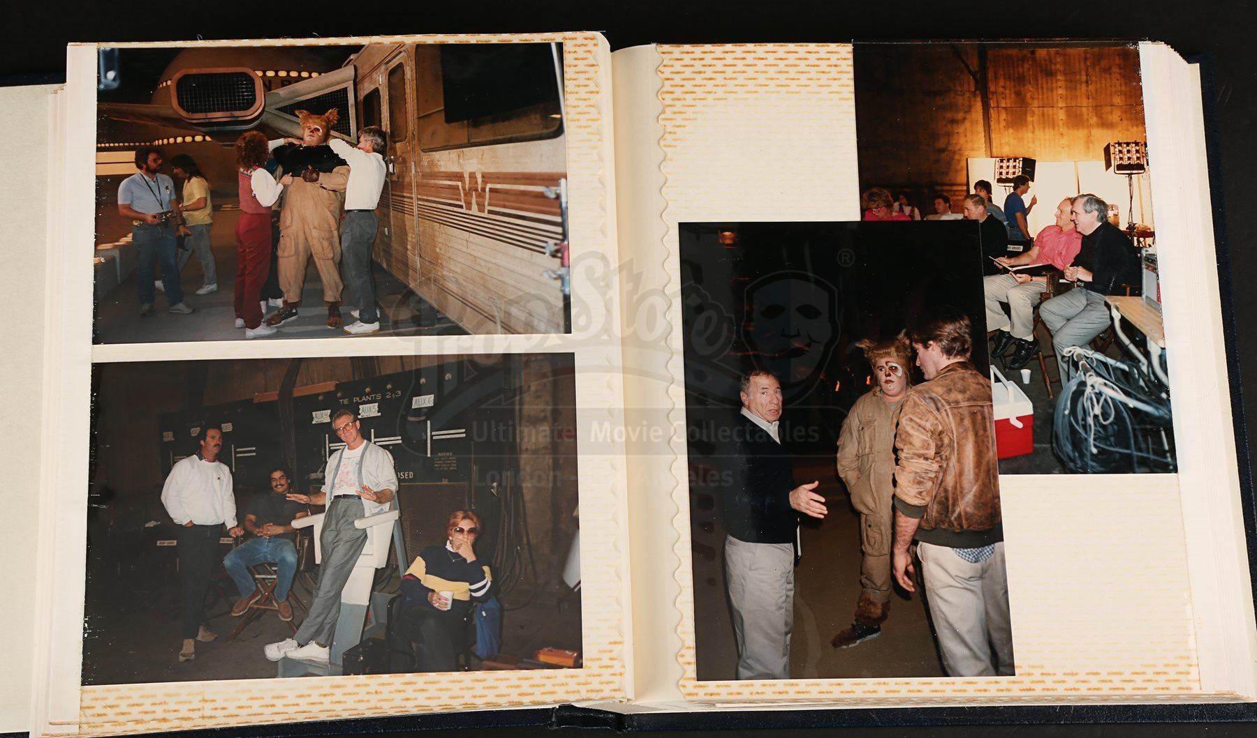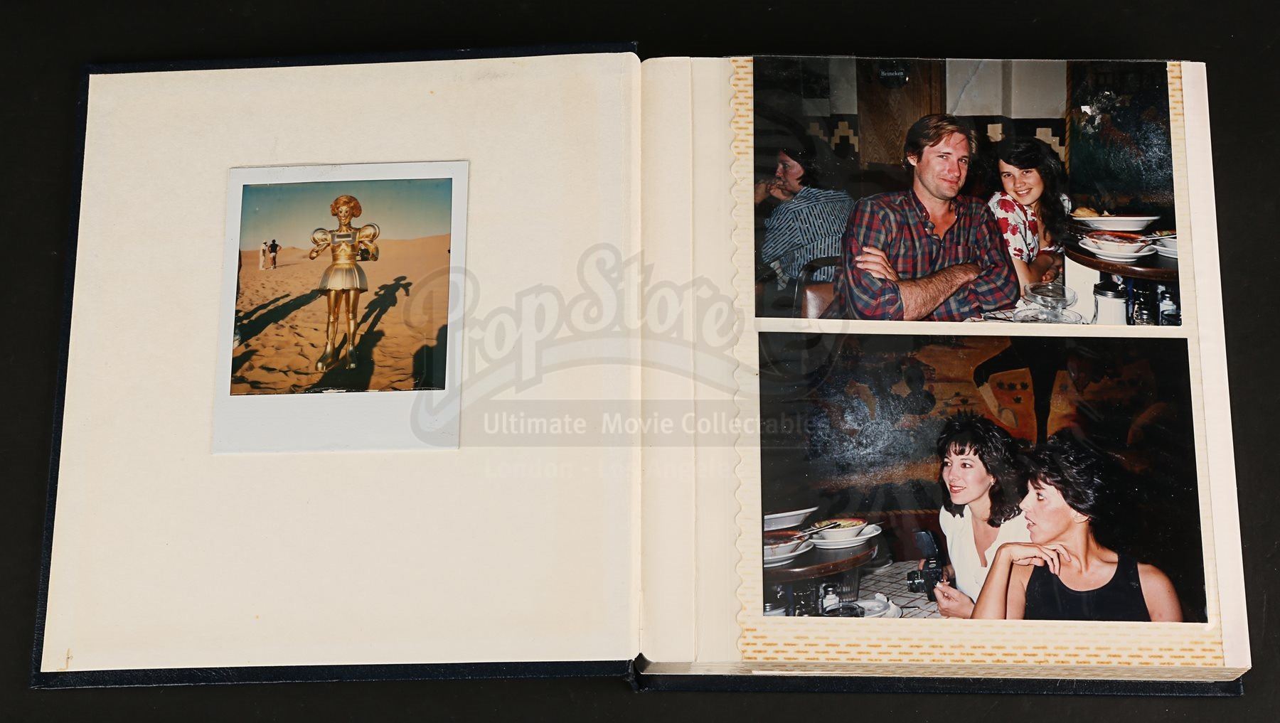 The mask is made of vacuum-formed plastic and is detailed with geometric lines for the cheeks and the nose. Finished in faux gold, the interior of the mask features several pieces of metal mesh adhered to the openings for the eyes, nose and mouth. The photo album is bound in blue leather with printed faux-gold patterns on the front cover and spine, and contains 65 colour photos and three Polaroid images showing various cast members on the set.