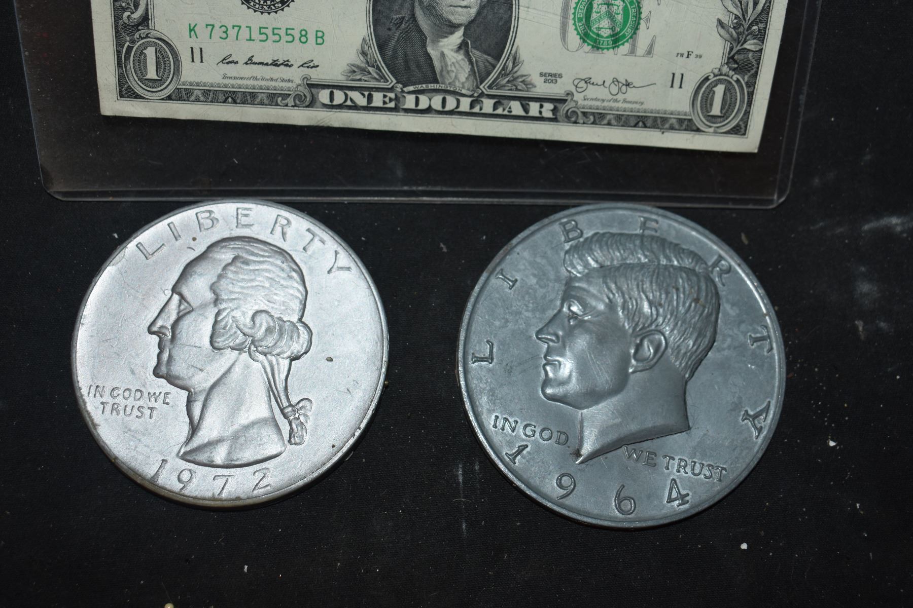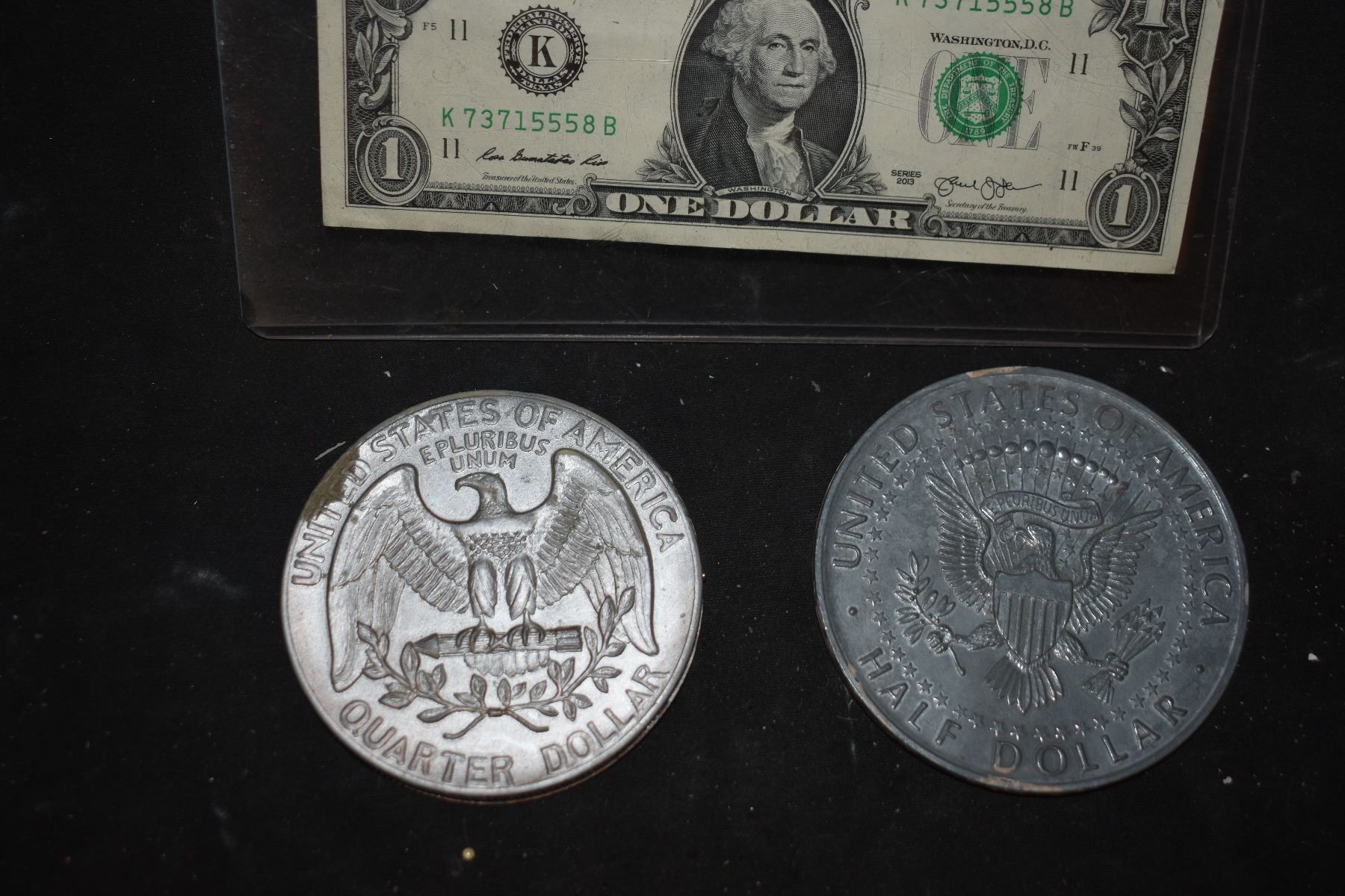 The Quarter is resin but the Fifty cent piece is cast metal.