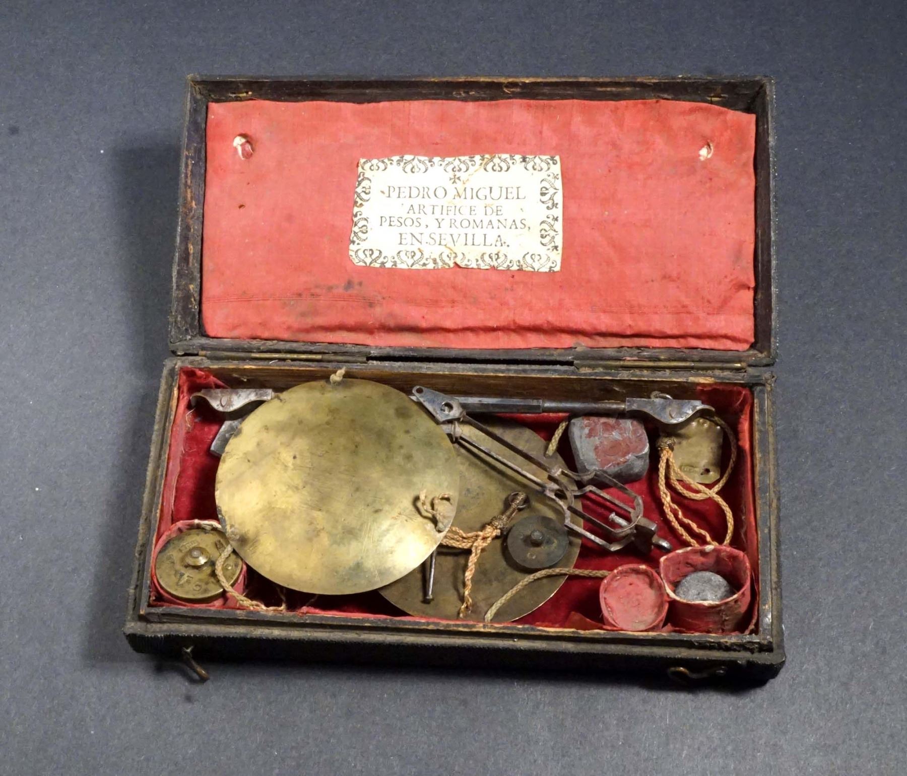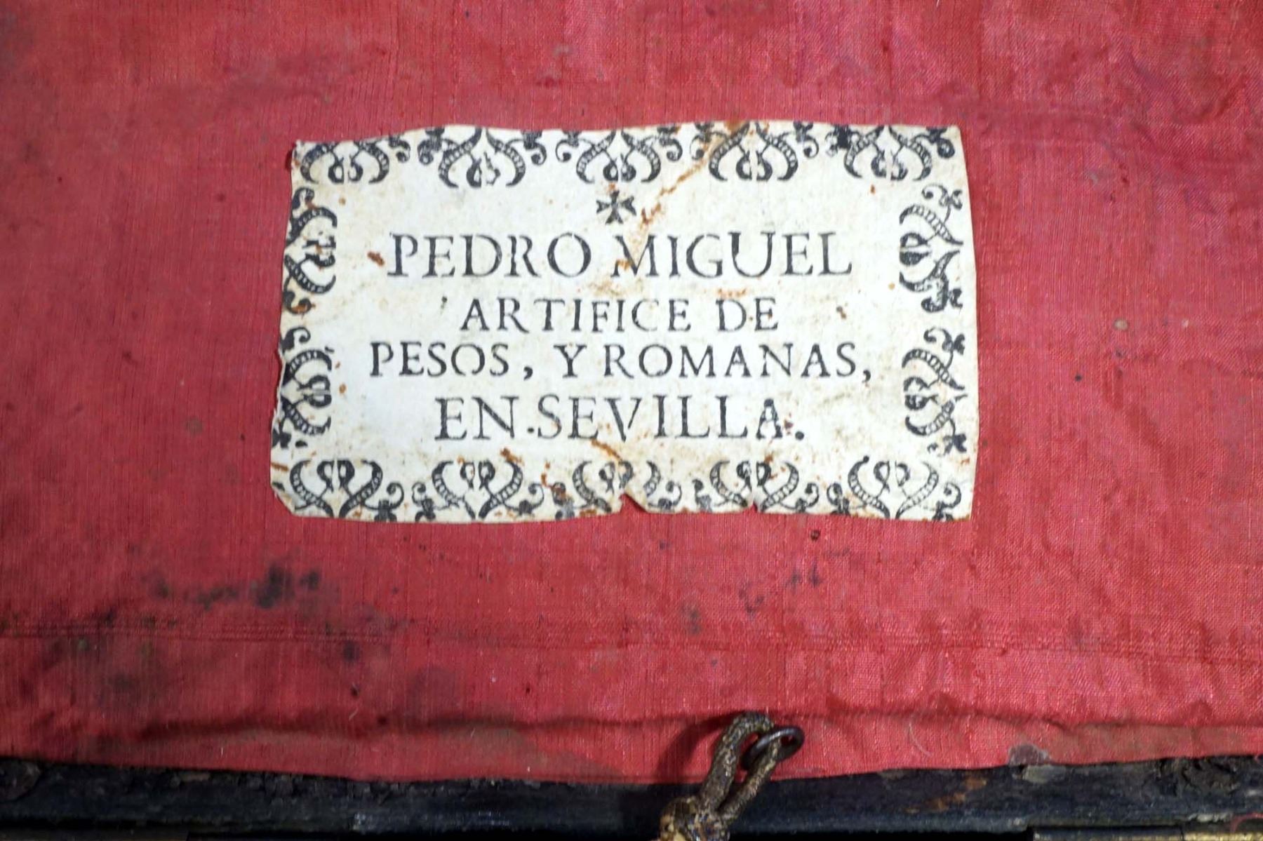Fabulous original Pedro Miguel Wooden box with Balance, six weights and Advertising Label for Seville based manufacturer. Several of the weights are countemarked for Government use. Needs to be re-strung.