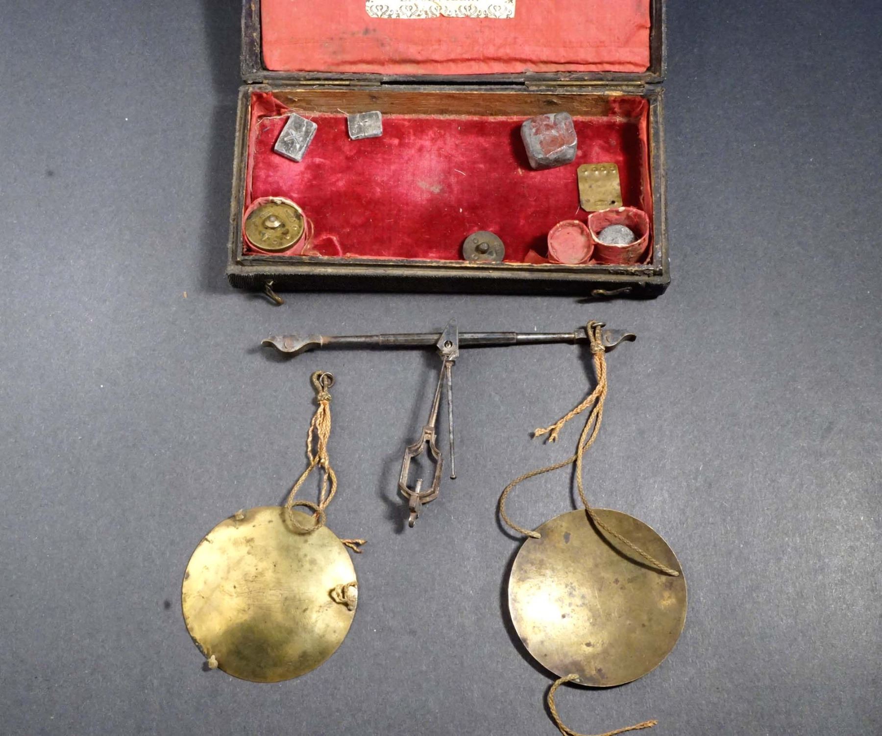 SPAIN 1750 Antique Balance Scales & 6 Weights Set in Original Snake Skin Box USED