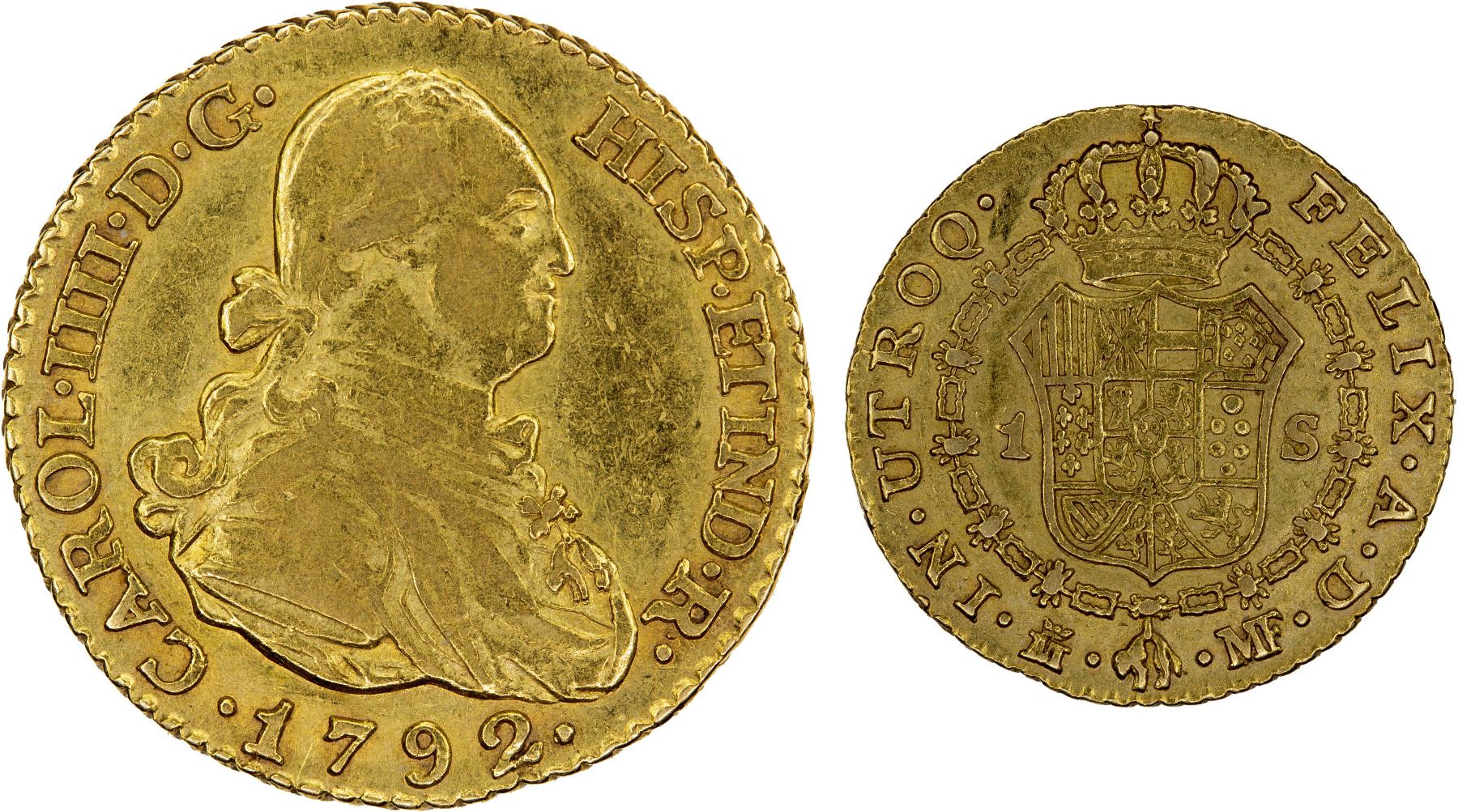 SPAIN: Carlos III, 1759-1788, AV escudo (3.35g), 1792, KM-434, assayer MF, crowned M mintmark, Madrid Mint, some light hairlines, VF-XF, ex Dr. Robert A. Rosenfeld Collection.