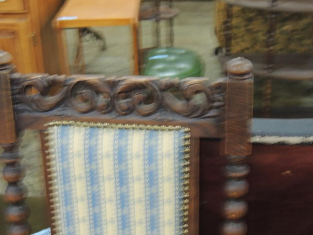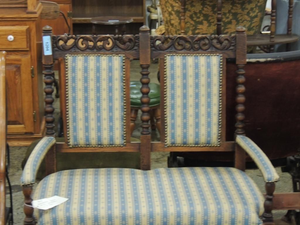 SPAIN HAND CARVED BENCH NEWER UPHOLSTERY BLUE AND WHITE STRIPE DESIGN. AS SHOWN. SEE PHOTO FOR MORE DETAILS.