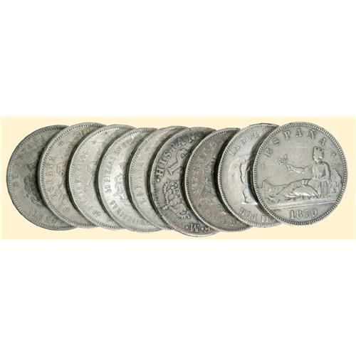 Lot of 9 pieces. 5 Pesetas 1800, 1870, 1871, 1875, 1876, 1878, 1890, 1891, 1898.