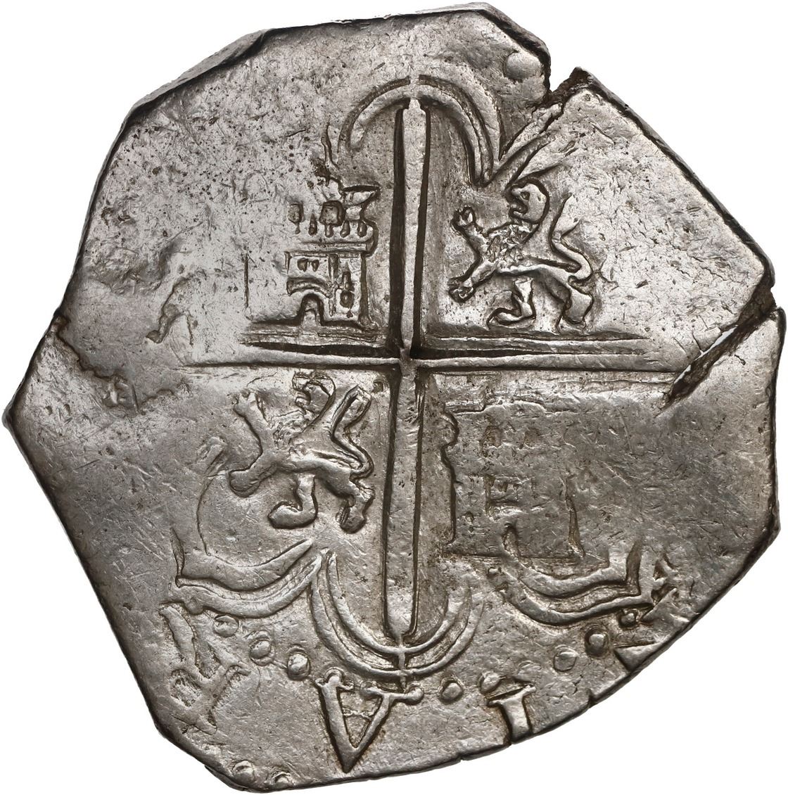 SPAIN, Seville, cob 4 reales, Philip II, 1593 date to right, assayer B to left not visible. Cal-452. 13.71 grams. Lustrous AU with sharp, nearly complete shield and cross, bold 3 of date, plugged hole at 1 o'clock.