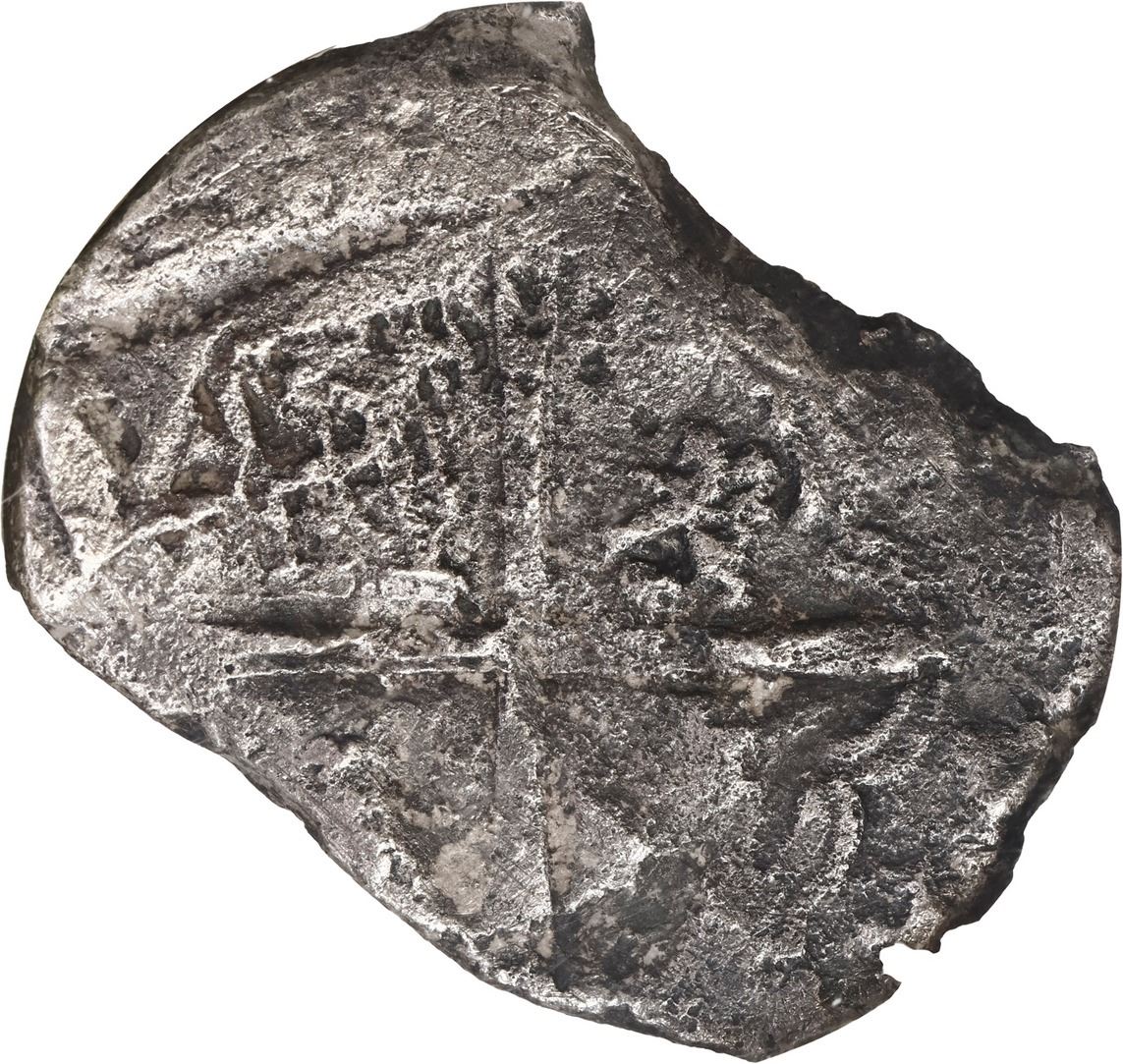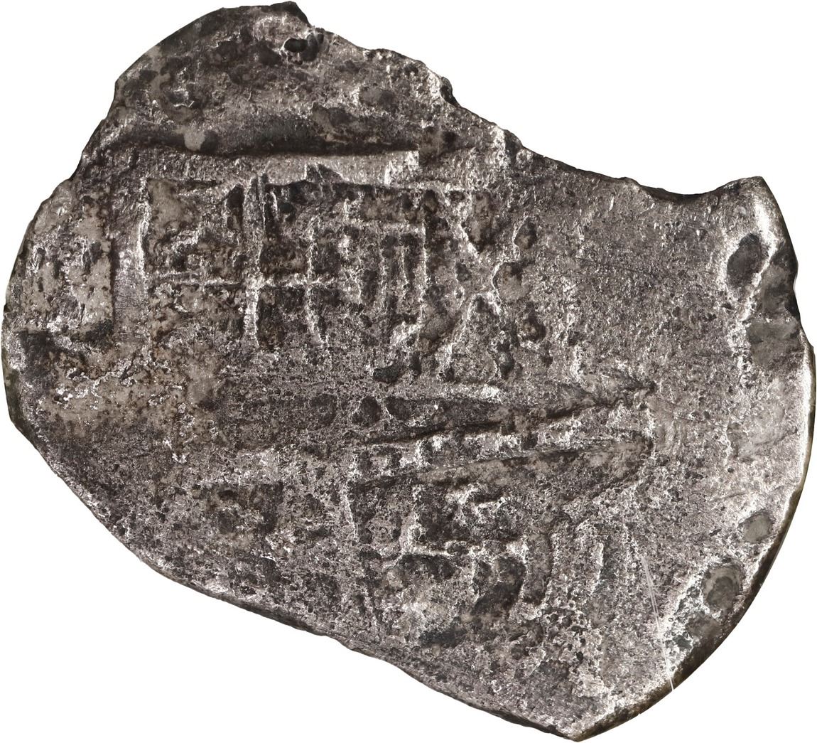SPAIN, Seville, cob 4 reales, Philip III or IV, assayer not visible, flipover double-strike error, NGC Genuine (Sao Jose). Irregularly corroded piece, curiously with traces of a cross on the shield side and vice versa from a rare type of double-strike where the coin flipped over in between blows. Recovered from: São José, sunk in 1622 off Mozambique, east of Africa