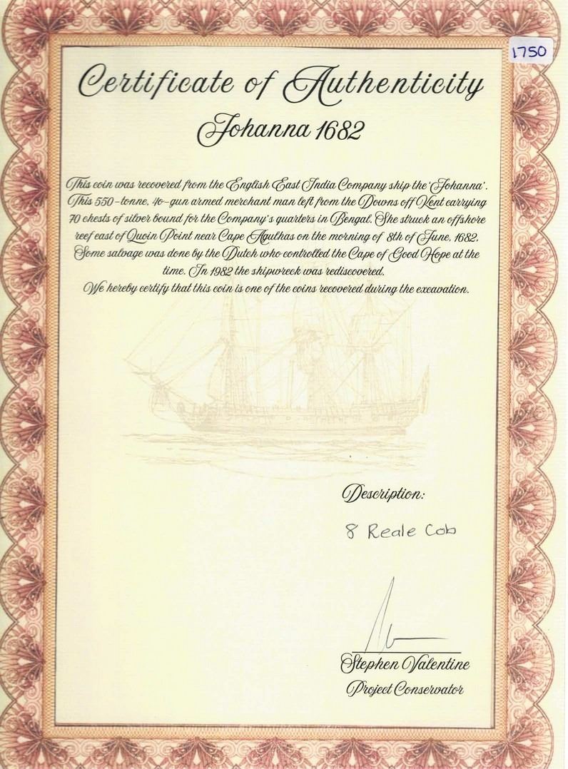 SPAIN, Seville, cob 8 reales, Charles II, assayer not visible. Cal-Type 117. 22.29 grams. Rare type from this wreck, crudely struck on an irregular planchet as usual for the type, with bold partial shield and cross. Pedigreed to the Steve Valentine Collection, with original certificate from the salvor/conservator. Recovered from: Joanna, sunk in 1682 off South Africa