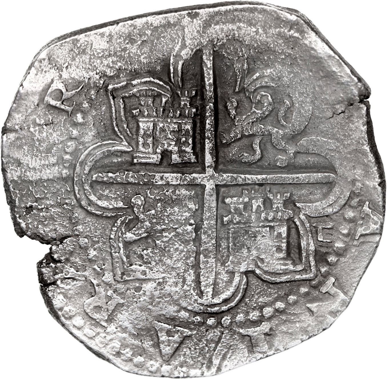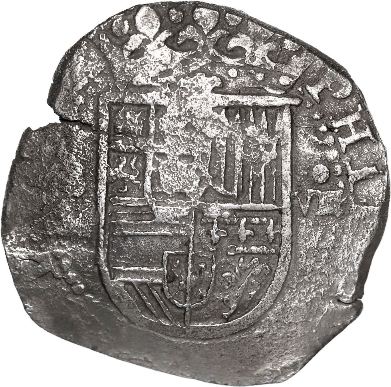 SPAIN, Seville, cob 8 reales, Philip II, assayer Gothic D at 4 o'clock outside tressure on reverse. Cal-720. 26.32 grams. Broad, non-round flan with minor edge-split, good full cross and shield, bold denomination, practically no corrosion, lightly toned. With original certificate from the salvor/conservator. Recovered from: Santiago, sunk in 1585 off Bassas da India in the Indian Ocean