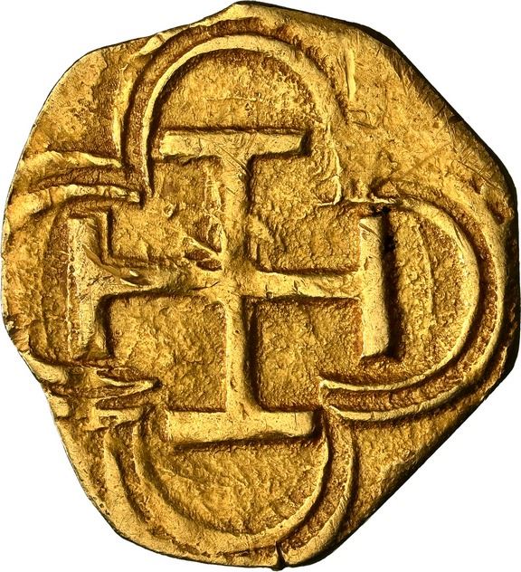 SPAIN, Seville, gold cob 1 escudo, 1590 date to right, assayer B below mintmark S to left, NGC Genuine / clipped. Cal-791; Fr-178. 2.56 grams. Full and clear date to right of nearly full cross with S above what could be B/C to left (NGC says just B), good full cross, XF or better for actual wear.