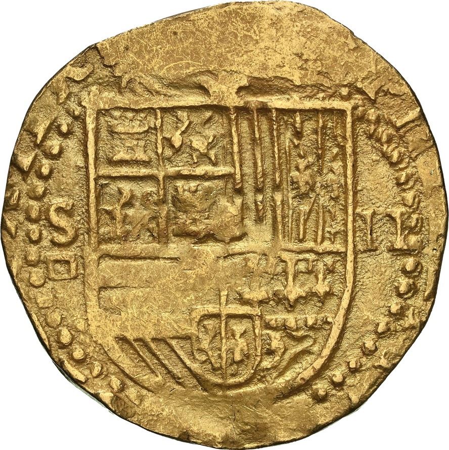 SPAIN, Seville, gold cob 2 escudos, Philip II, assayer Gothic D below mintmark S to left, denominati
