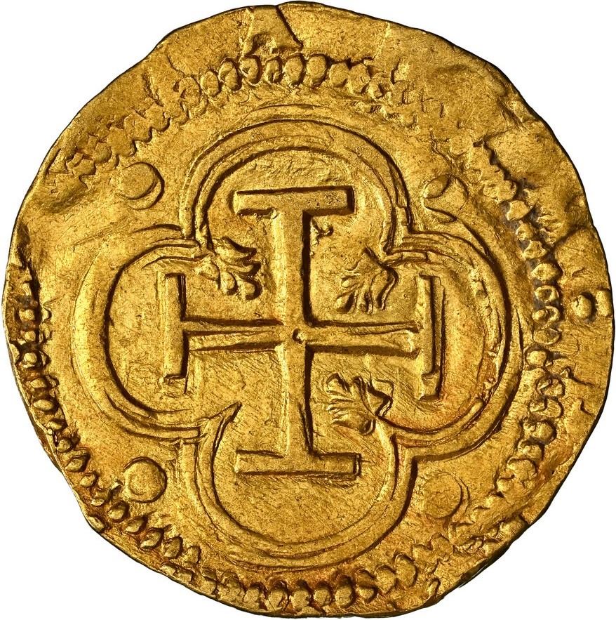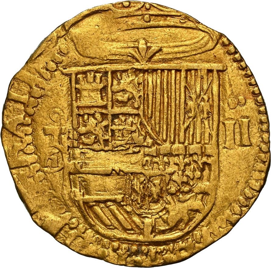 SPAIN, Toledo, gold cob 2 escudos, Philip II, assayer M-in-circle below mintmark oT to left, NGC AU 55. Cal-865; Fr-170. 6.66 grams. Nice luster, choice full cross-and-tressure, bold full denomination II with two dots above to right of well-detailed full shield, the oT and M-in-circle to right also clear, some legend but overall a smallish flan for the type.