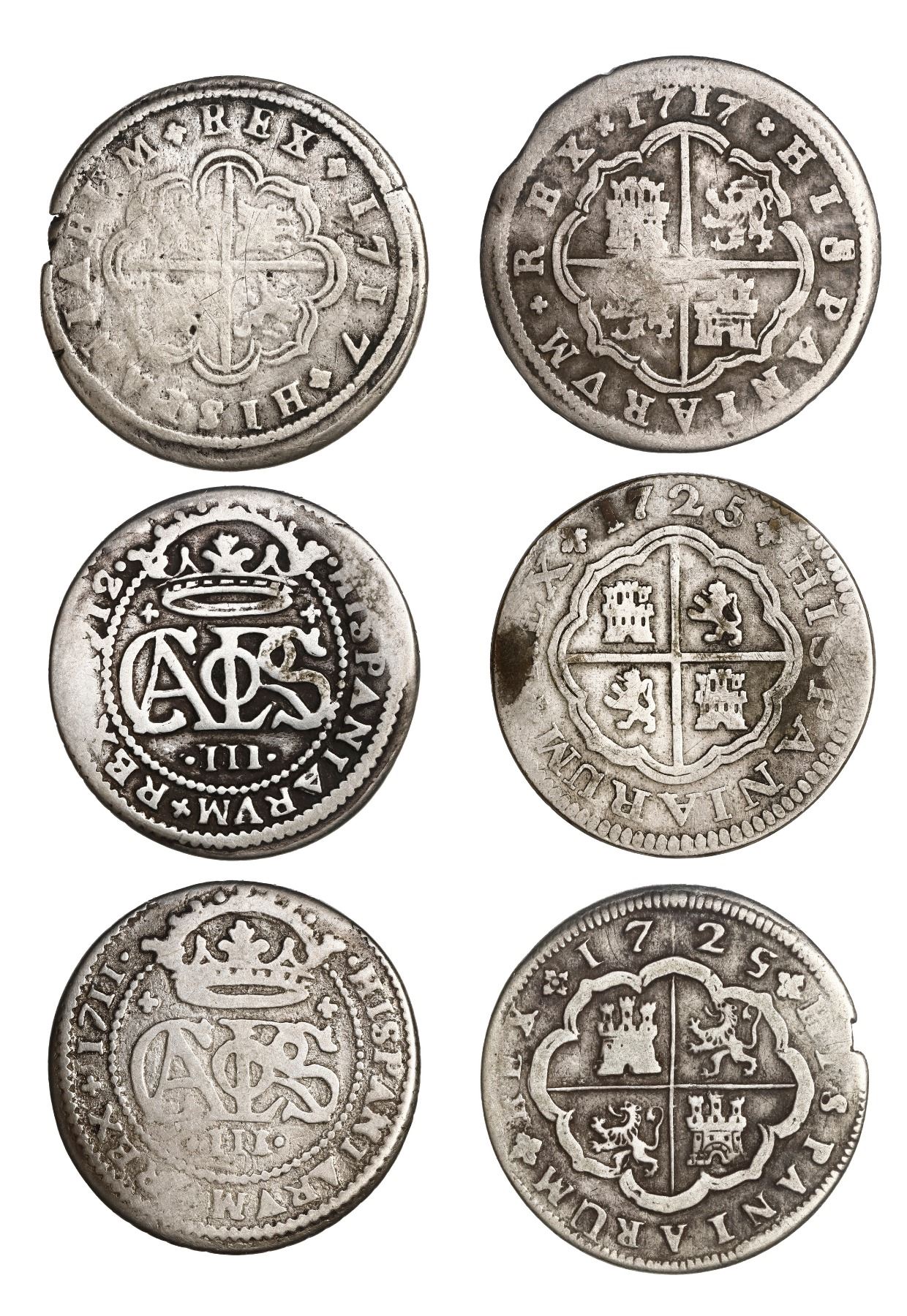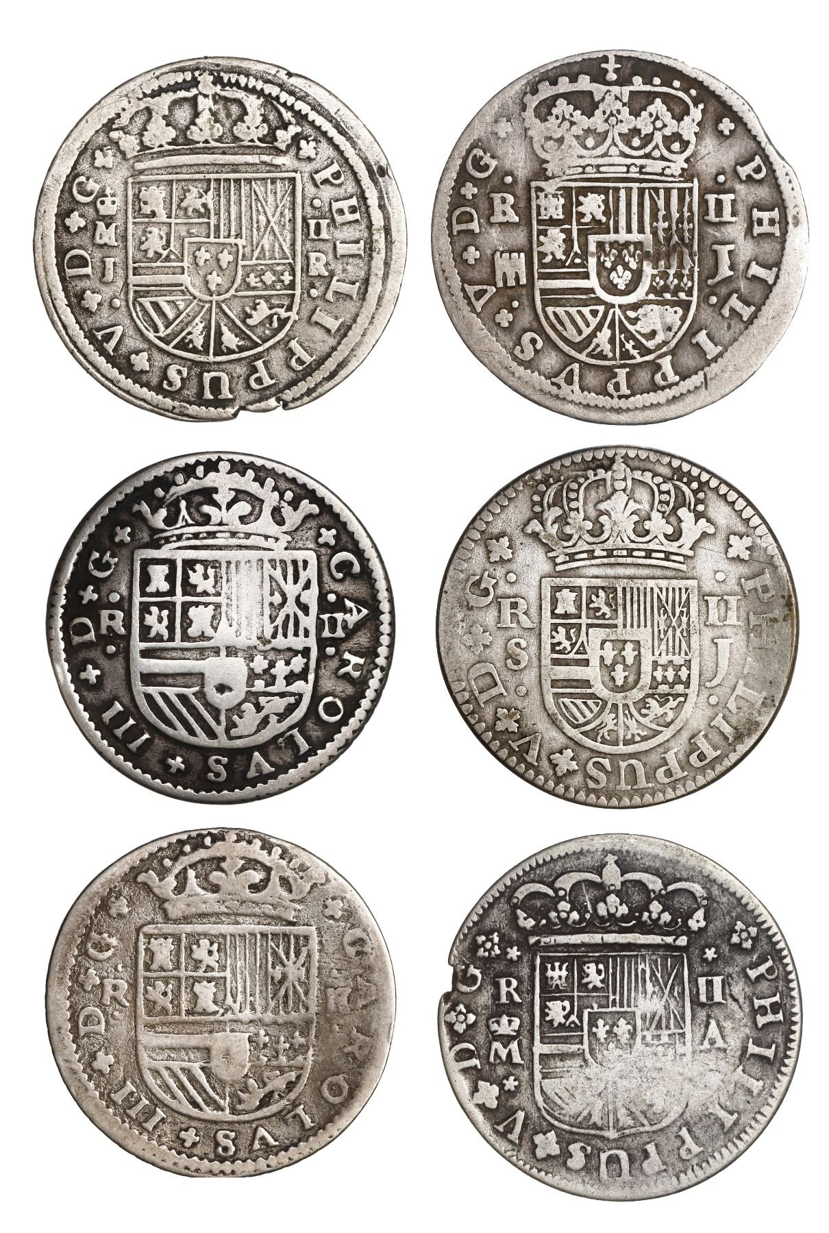 SPAIN, various mints, lot of six 2 reales "pistareens" of Charles III Pretender and Philip V, various dates and assayers. 27.81 grams total. All generally Fine or a little better with clear dates, a few with minor surface marks or as-made edge flaws.