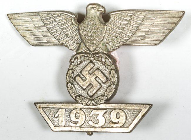 Metal clasp, 1 1/4" x 2", the "spange" to the Iron Cross featuring an eagle with a swastika, atop a trapezoid with the date: "1939". As it was possible for a holder of the 1914 Iron Cross to be awarded a second or higher grade of the 1939 Iron Cross, a special clasp was designed which typically was attached to the 1914 Iron Cross medal ribbon beneath a tunic button. Slightly oxidized, else very good.