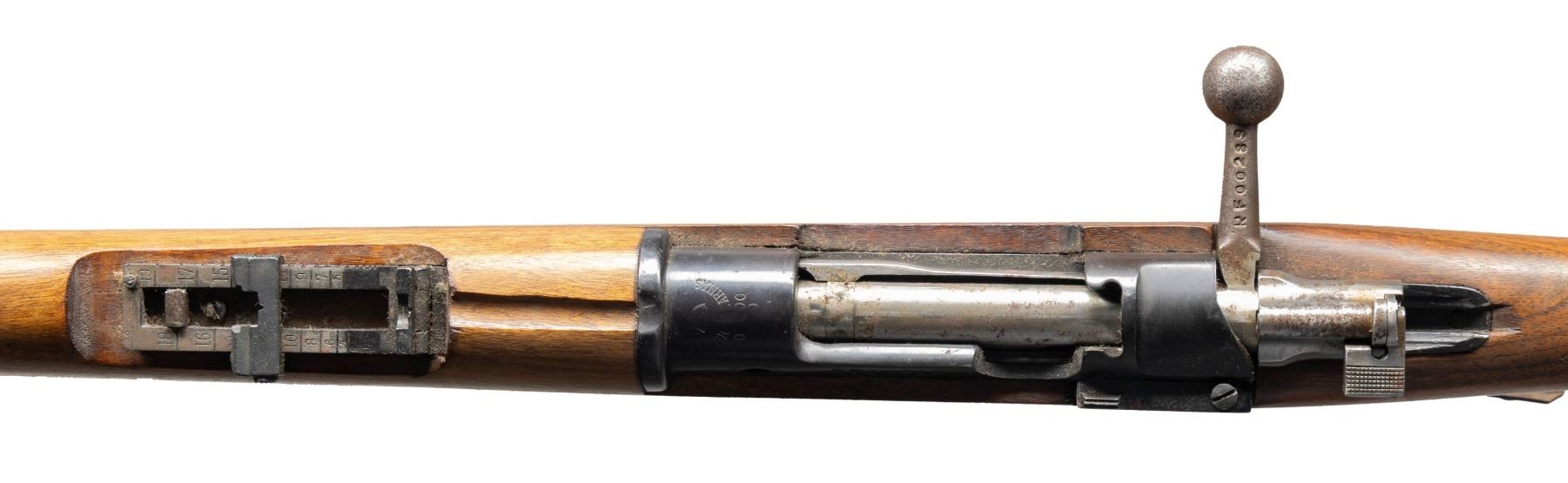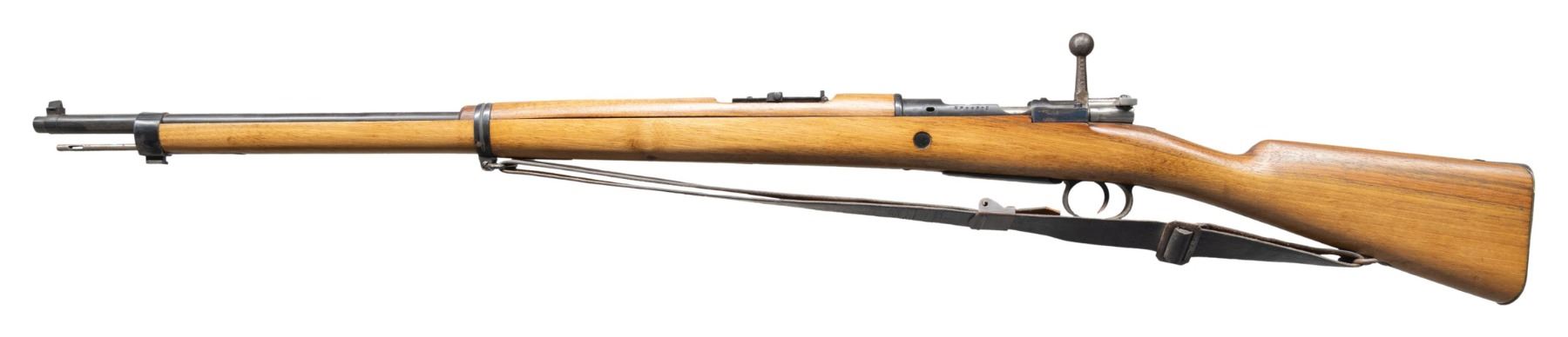 Cal. 7mm Mauser. S# RF00289. Bbl. 29". Standard Oviedo Spanish 1893 sights. Matching numbers on receiver, bolt handle, trigger guard & floorplate. Other parts appear unnumbered. Receiver ring has Oviedo markings with illegible date due to arsenal reblue. Left side of receiver has armory added vent hole. Arsenal reblue finish. Hardwood stock set with bottom mounted sling swivels & leather sling. Cleaning rod present. CONDITION: sanded stock set has added finish with a small crack behind upper tang, a handguard crack ahead of rear sight, some scratches & handling marks. Metal retains 70% arsenal rework blue with pitting on bolt, scattered oxidation, some blued over pitting, edge & handling wear. Action functions properly when hand cycled. Bore shows scattered oxidation but strong rifling. (25-3878/MJC). CURIO. $300-400.