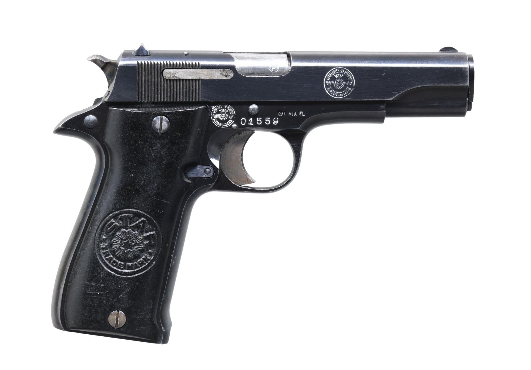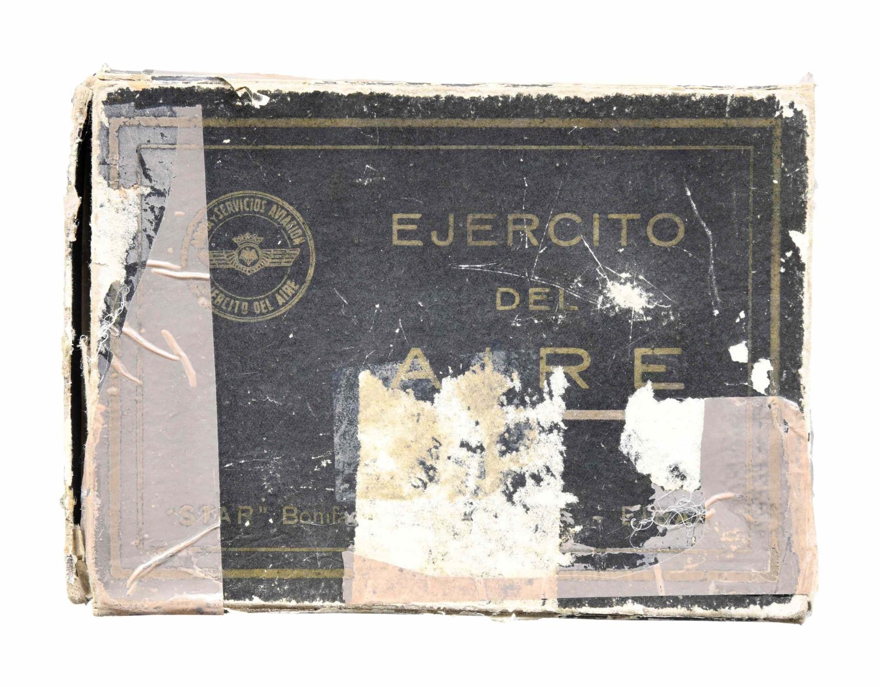 PISTOL WITH BOX. Cal. 380 ACP. S# 279934. Bbl. 3 3/4". Model S semi-automatic pistol mfg. in Spain by Star under contract for the Spanish Air Force. Left side of the frame and slide exhibit standard proofs and markings. Right side of the slide and frame are stamped with the Spanish Air Force insignia, with the frame also being marked "01559", followed by a Century Arms' import mark. Butt of frame is marked "S/ 279934". Metal components exhibit a blue finish overall, save for on the trigger and chamber, which are polished in-the-white. Frame is mounted with 2-piece Star logo black synthetic grips. Half-moon blade front sight with square notch rear sight. All serialized parts are matching via "01559" and include the frame, slide, and bbl. MAGS: Two 8-rd. mags., matching via "1559" on the floorplates. UNATTACHED ACCESSORIES: generic black plastic hard case and original cardboard box containing factory paperwork. CONDITION: very good, with metal components retaining the majority of their original factory blue finish, exhibiting some areas of wear and thinning, some light superficial handling marks, as well as a few spots of light surface oxidation and pitting. Very bright bore, exhibiting some areas of light oxidation and/or pitting, while retaining strong rifling throughout. Grips exhibit scattered marks from handling and storage but otherwise remain sturdy and serviceable. Box is poor, exhibiting tearing and taped repairs overall. (24-6825/MLW). CURIO. $300-500.