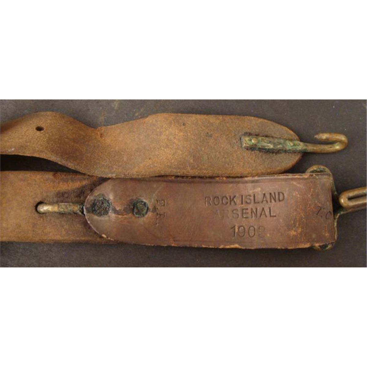 THIS IS A SPANISH-AMERICAN WAR, 1903 LEATHER EQUIPMENT, WITH A CARRY STRAP AND HOOK ENDS * IT IS MARKED "ROCK ISLAND ARSENAL 1903" WITH THE INSPECTOR'S MARK IN 2 PLACES. IT IS 45" LONG WITH BRASS HARDWARE. *