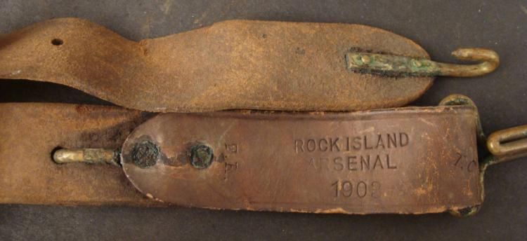 THIS IS A SPANISH-AMERICAN WAR, 1903 LEATHER EQUIPMENT, WITH A CARRY STRAP AND HOOK ENDS * IT IS MARKED "ROCK ISLAND ARSENAL 1903" WITH THE INSPECTOR'S MARK IN 2 PLACES. IT IS 45" LONG WITH BRASS HARDWARE. *