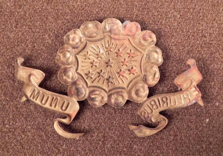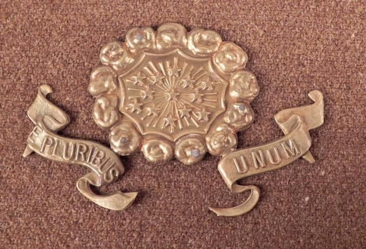 SPANISH-AMERICAN WAR BRASS INSIGNIA WITH 13 STARS, AND THE MOTTO "E"PLURIBUS UNUM"-STAMPED ON THE BRASS3 3/4" WIDE &2 1/2" LONG--NOPRONGS--APPEARS TO HAVE BEEN A PLATE FROM EQUIPMENT